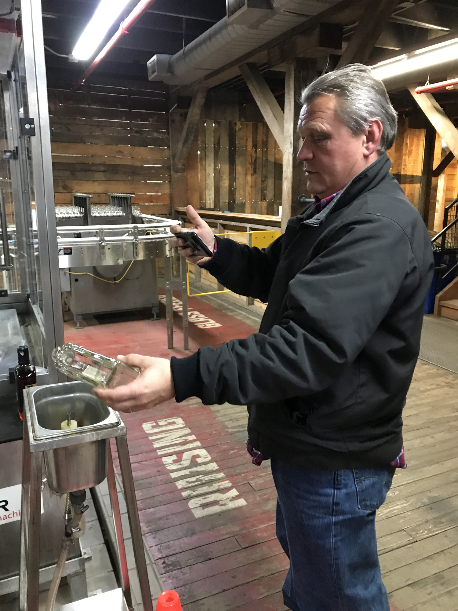 After fermentation it goes through a distillation process. This part got pretty technical and there are multiple steps, but what I gathered was the liquid is turned into steam and passed through copper tubes. The copper picks up the sulfates, and the process is repeated until the liquid turns into “low wine.” Once again it is turned into gas, then back into liquid and becomes high wine. I loved the machine that did the process. It was really pretty and the whole thing was fascinating if a little over my head. Bill of course was nodding intently!