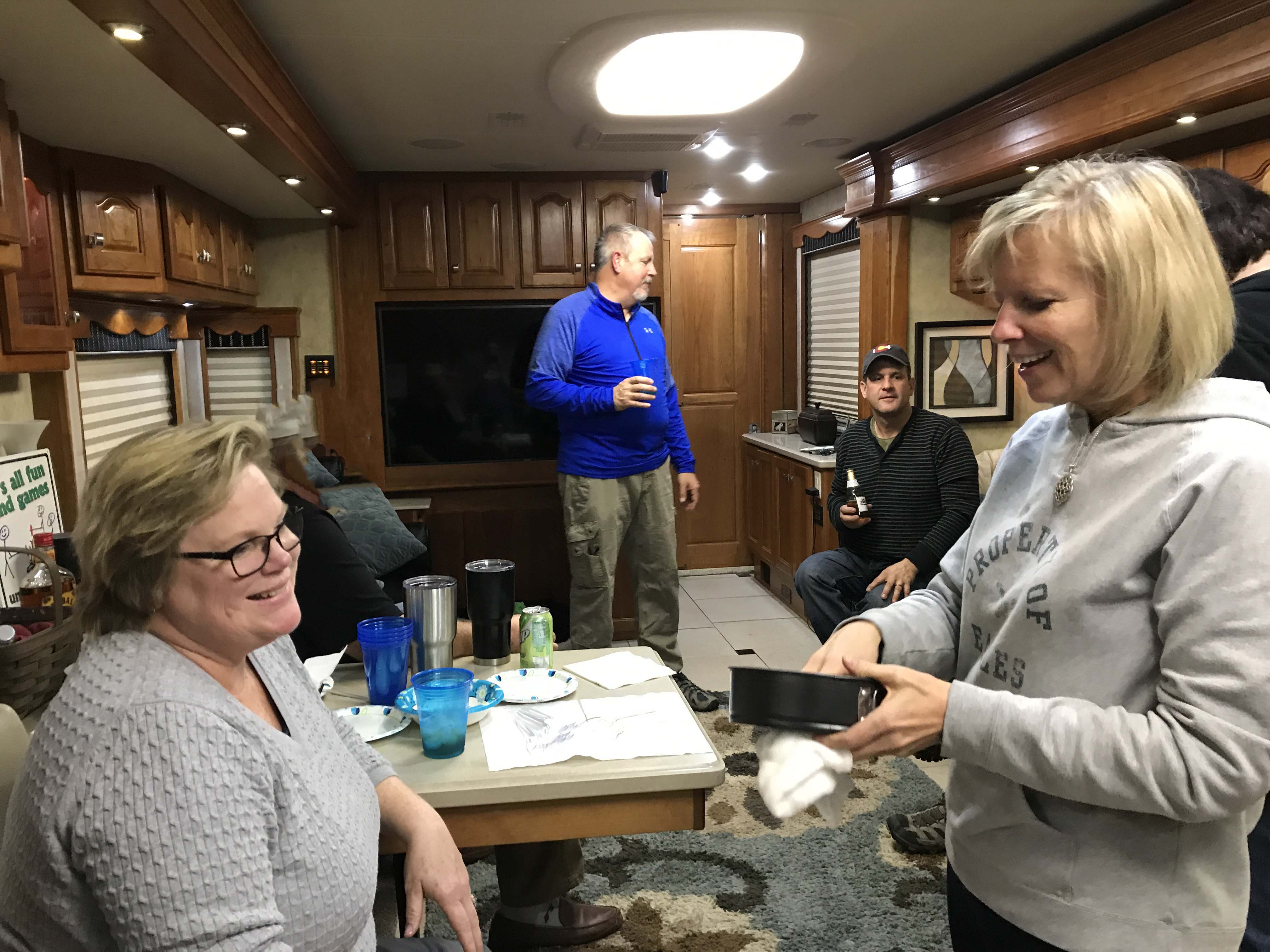 Afterwards he dropped me off at a nail place while he went to Home Depot and Office Depot.  I really wanted a pedicure since my feet have been pretty beat up since Amazon. I went to this really great place as a walk-in and got a pedicure and eyebrow wax for $43.  Awesome deal, and they were super nice.  The timing worked out perfectly too because Lee got done 5 minutes after I did, so we went back to the campground to get ready for happy hour.  Cori and Greg had made plans to have us over at their place for drinks and dinner and we were really looking forward to it. As always, we had a wonderful time, and we got to meet John and Cathy who met Cori and Greg when Greg installed their solar. It was really fun getting to know them and their two puppies Phoebe and Leila!