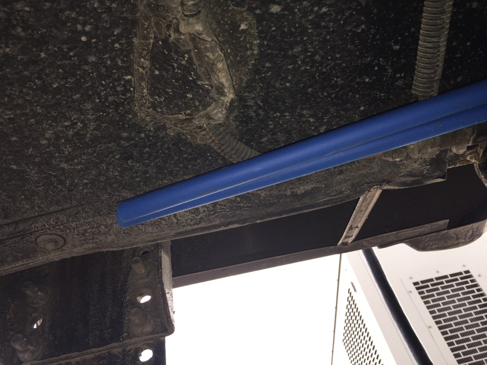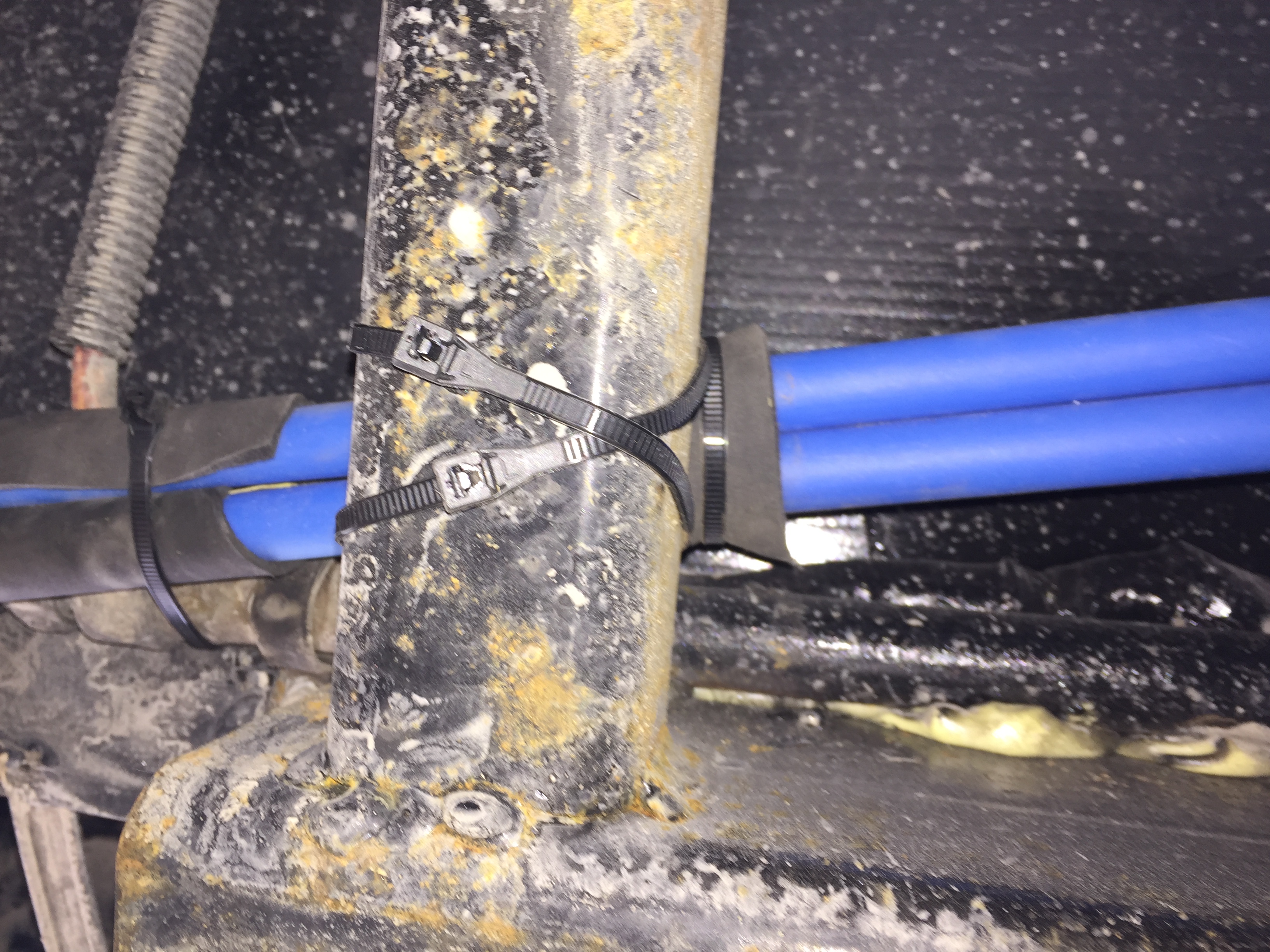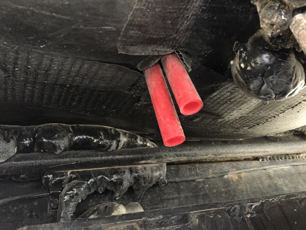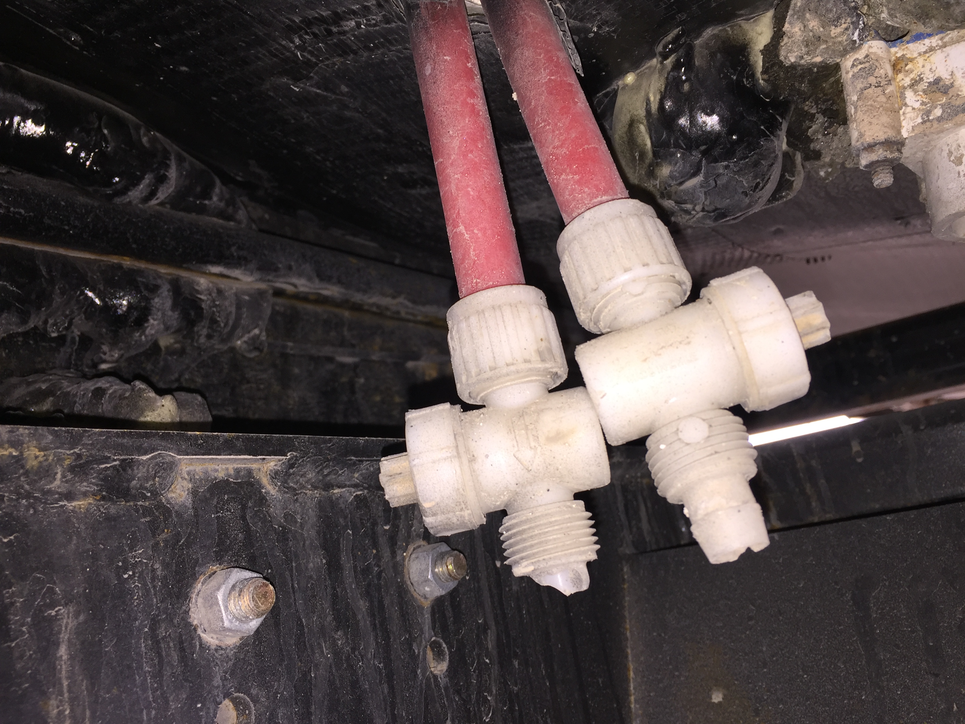 Now with the Mor-Ryde, the only way to get to them is to actually crawl underneath the rig on my back or side and reach up and around the new suspension components. Not ideal. Here’s a look at the view from underneath, and as you can see, the new suspension completely blocks the valves, which are the white plastic pieces attached to the red pex lines. The large mass of black steel to the right is where I used to be able to reach through.