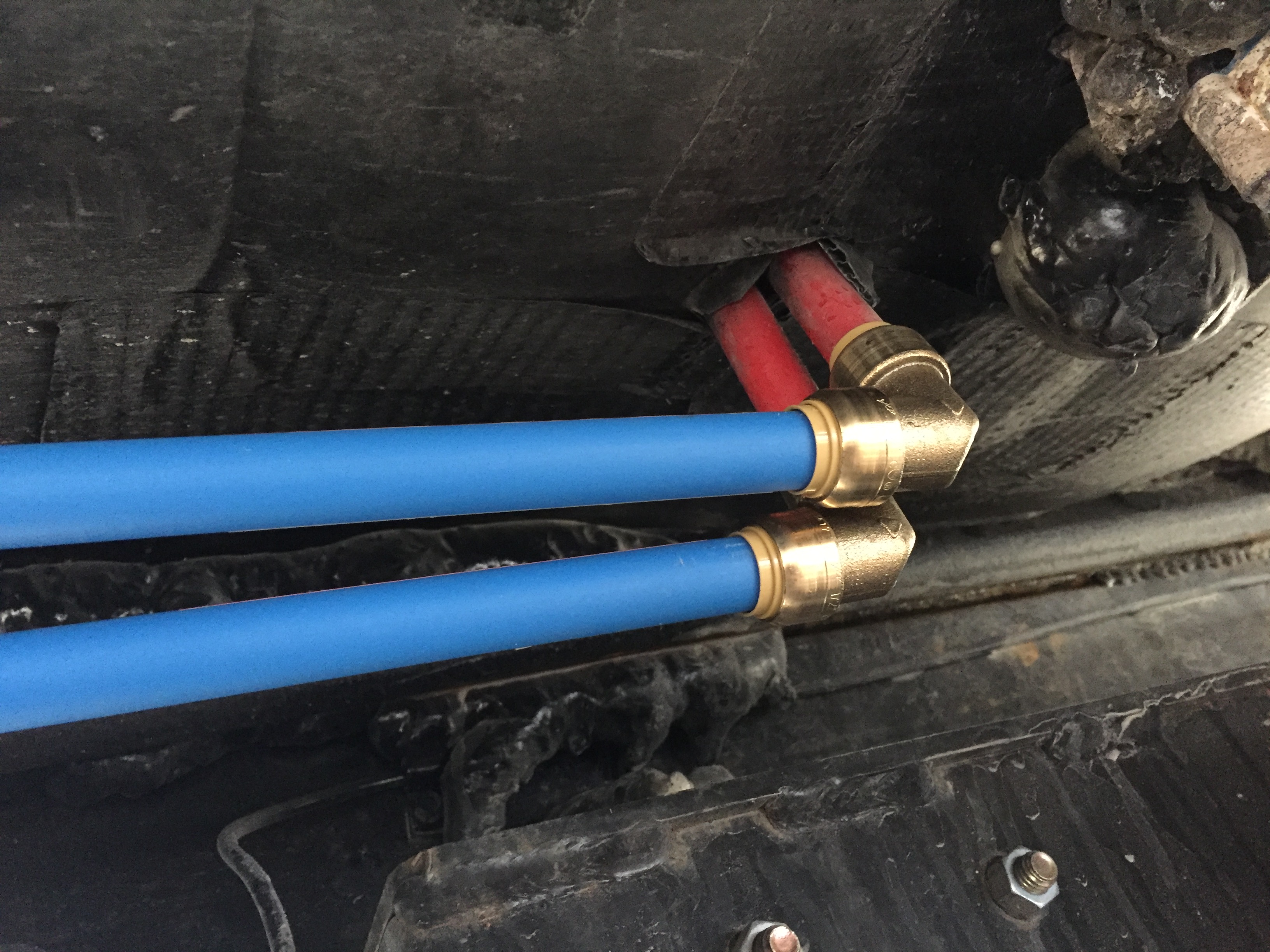 Unfortunately, they didn’t reach to exactly where I wanted, but I didn’t want to buy 10′ of pex to use 7′, so I decided to live with the almost perfect location, near the convenience center. I cut them back a little so I didn’t have to deal with the bracket for the rear jack, and offset them so I could easily reach the one on the inside.
