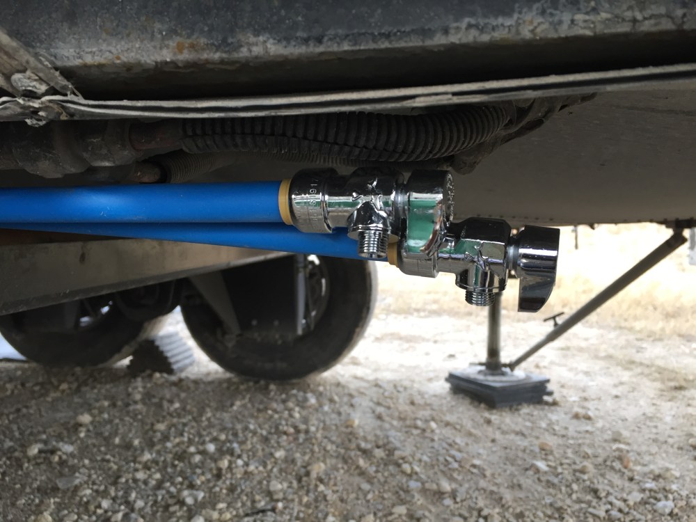 James – The a similar problem of not being able to reach applies to the fresh water drain valve, along with the fact that I hate that it just dumps water straight down to the ground underneath the rig. The next project is to extend that pipe off to the side, so I can put a fitting and either a gray/black water hose or an adapter for a garden hose on it and run it away from the rig to drain, as well as relocate the valve. Crawling under the rig is not something I enjoy doing. – Lee