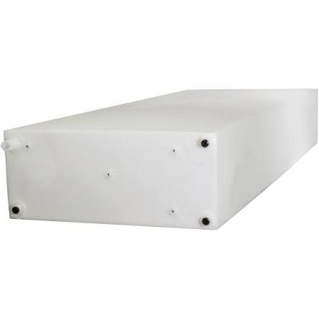 UPDATE: A couple of folks have indicated they’d like a better explanation on how this phenomenon happens, so I am going to try it from a different angle. To begin with, in my attempt to locate a decent picture of a fresh water tank with labels for the various inlets and outlets, I chose one that doesn’t look like most fresh water tanks, and also doesn’t show the fact that the overflow line isn’t just attached to the tank, but actually goes inside the tank, and are often improperly installed or poorly designed so that they extend below the level of the fitting, sometimes by several inches. So there’s a more accurate representation of the tank itself, below this paragraph. In this picture, the 100 gallon tank is 81″ x 26″, and only 11″ tall. This is a crucial factor, because the vent hose goes in on the side, so it’s already BELOW the top of the water level if the tank is completely full. That’s how the siphoning gets started. Then, if the hose is improperly installed or poorly designed, and extends 3″ down, it’s maybe 4″ below the water line, which will allow 1/3 of the capacity to be siphoned out. Add to that the vacuum effect, because it’s a closed system, and it can pull down the center of the tank, which helps keep the siphoning going. Hopefully that makes more sense.