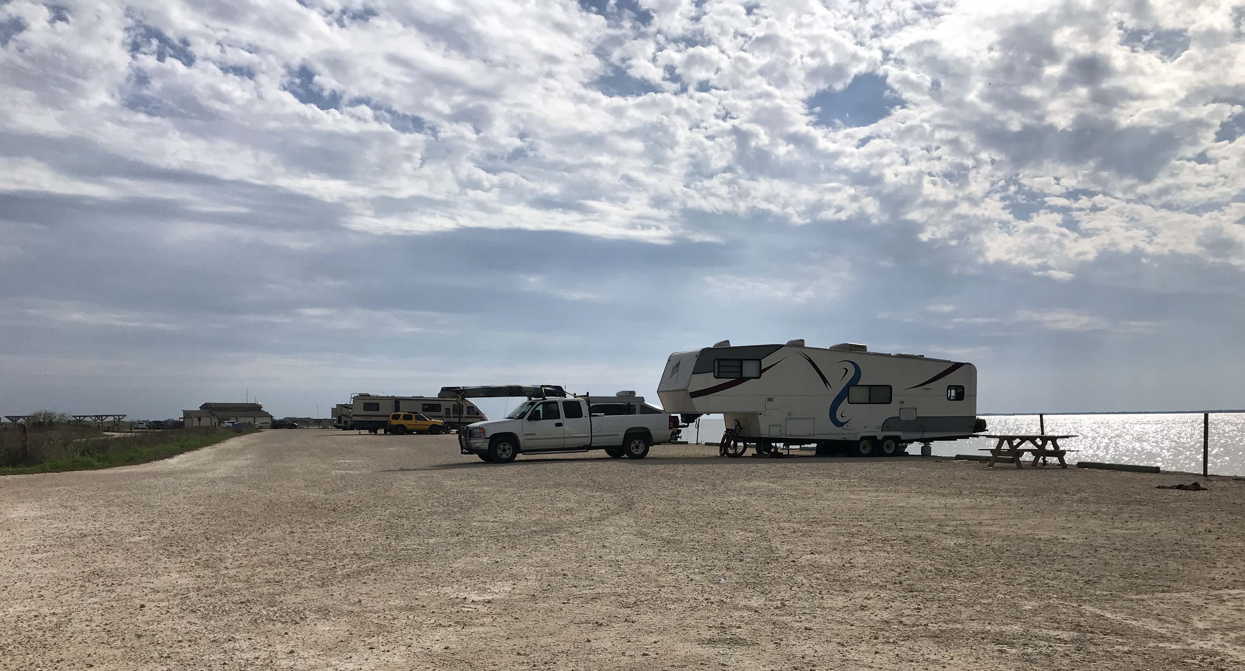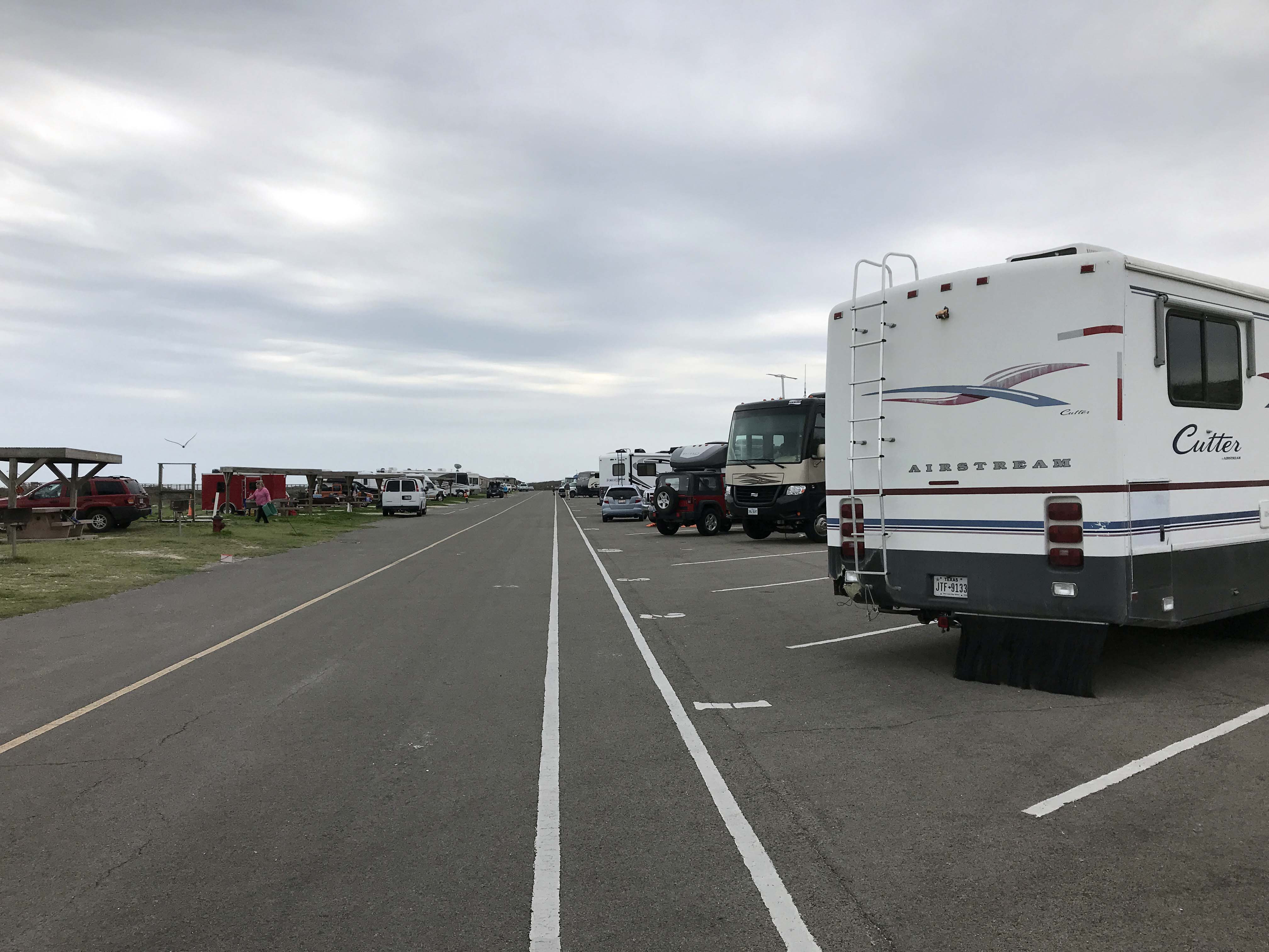 We were pleased to find out when we arrived that although the campground on the Gulf side, Malaquite, was full, the campground on the Laguna side, Bird Island Basin had lots of spots.  When we pulled in we were very happy that we were able to grab #34 on the end, and squeezed ourselves in.
