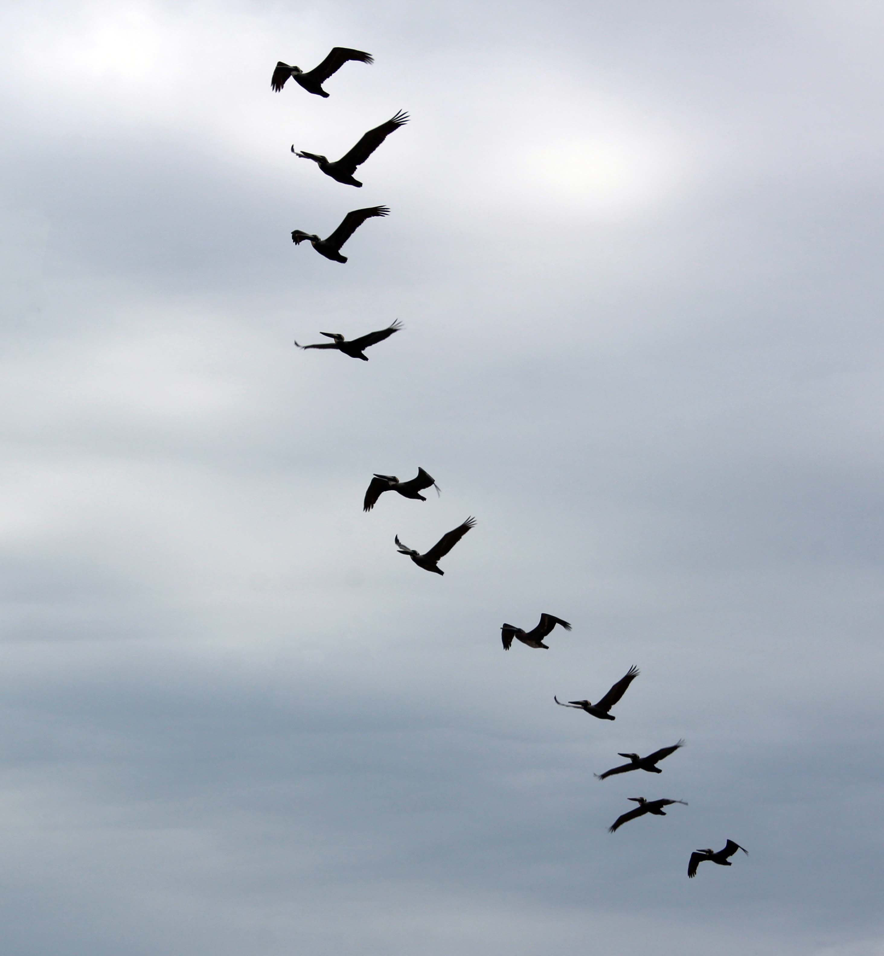 Tons of pelicans flying in groups. We saw hundreds of them.