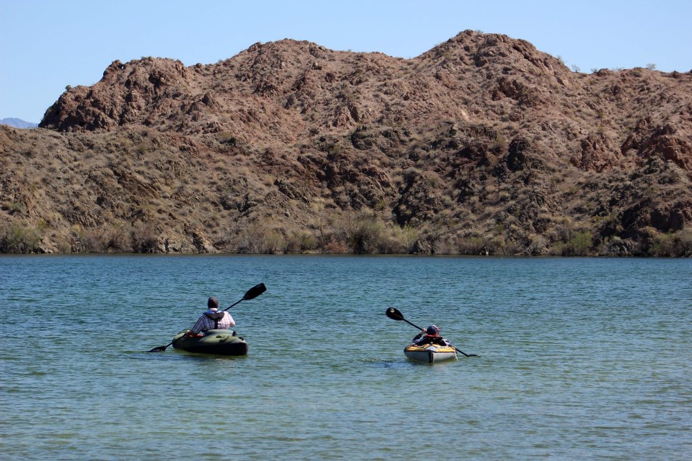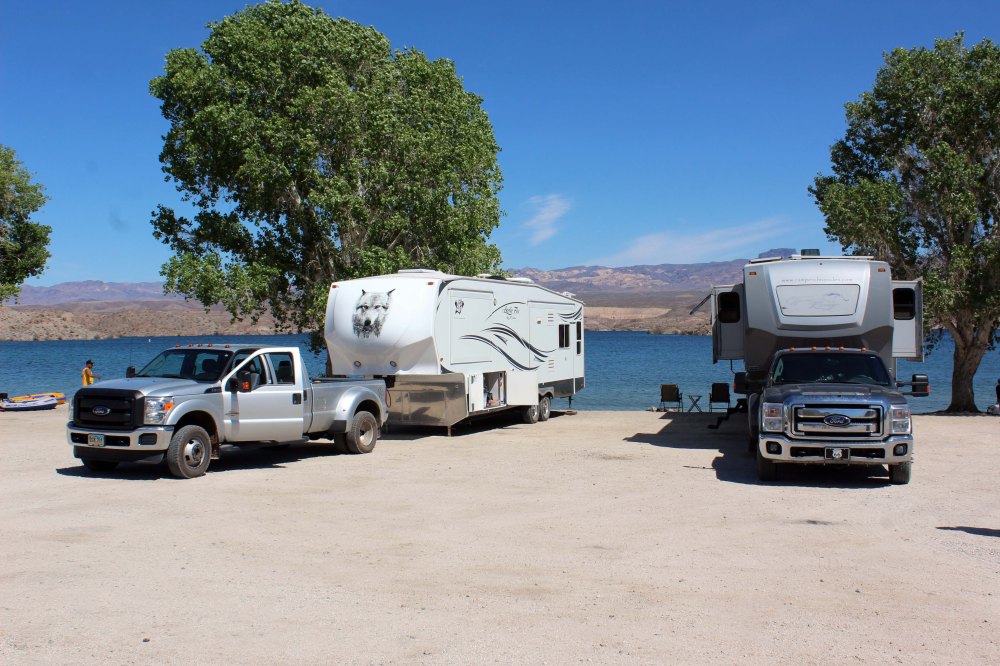 When we travel with people we generally find it is easier to pick a place to meet and then allow everyone to get there in their own time. Bathroom, pet, and lunch breaks vary by couples, and we’ve found it’s easier to just let people do their own thing. Surprisingly, despite the variation, people almost always get to the meeting place pretty close to each other so it all works out fine in the end. Since we were going to a boondocking spot we had never been to, Ben picked a gas station as a meeting place and we followed him the last little bit in. Telephone Cove is part of the Lake Mead Federal Recreation area and just west of Laughlin, Nevada. There is a four mile dirt road and the turn off has a very small sign, so we were glad Jo was directing us via text.