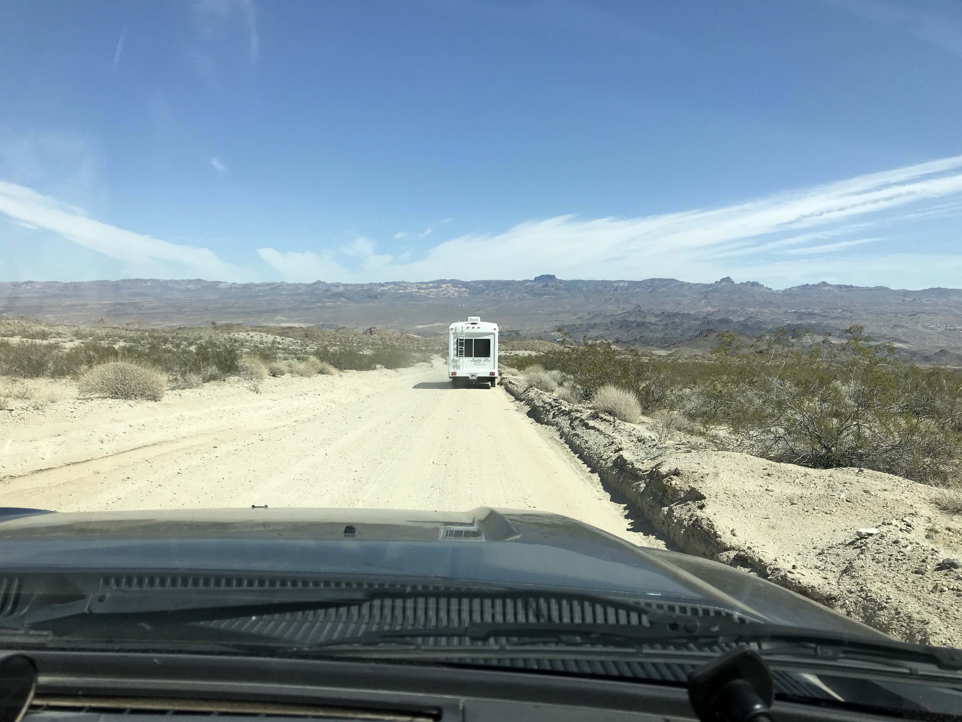 The only downside was our gas mileage was terrible. Normally we get over 10-119mph when traveling, but the combination of steady climb and high winds dropped us down to 6.6mph. Plus when I was driving I found I couldn’t really relax because constant minor adjustments for the wind were called for. Eventually we hit Arizona though and we stopped at a Passport America for the night. When we travel and are just looking for a place to sleep we find these are always reasonably priced, and OK for what you are paying. Plus, with full hookups Lee can dump at our site which saves us time the next morning. The next morning we were up and out pretty early, we hadn’t adjusted to the time change, and by noon were pulling into our boondocking spot to meet Jo and Ben.