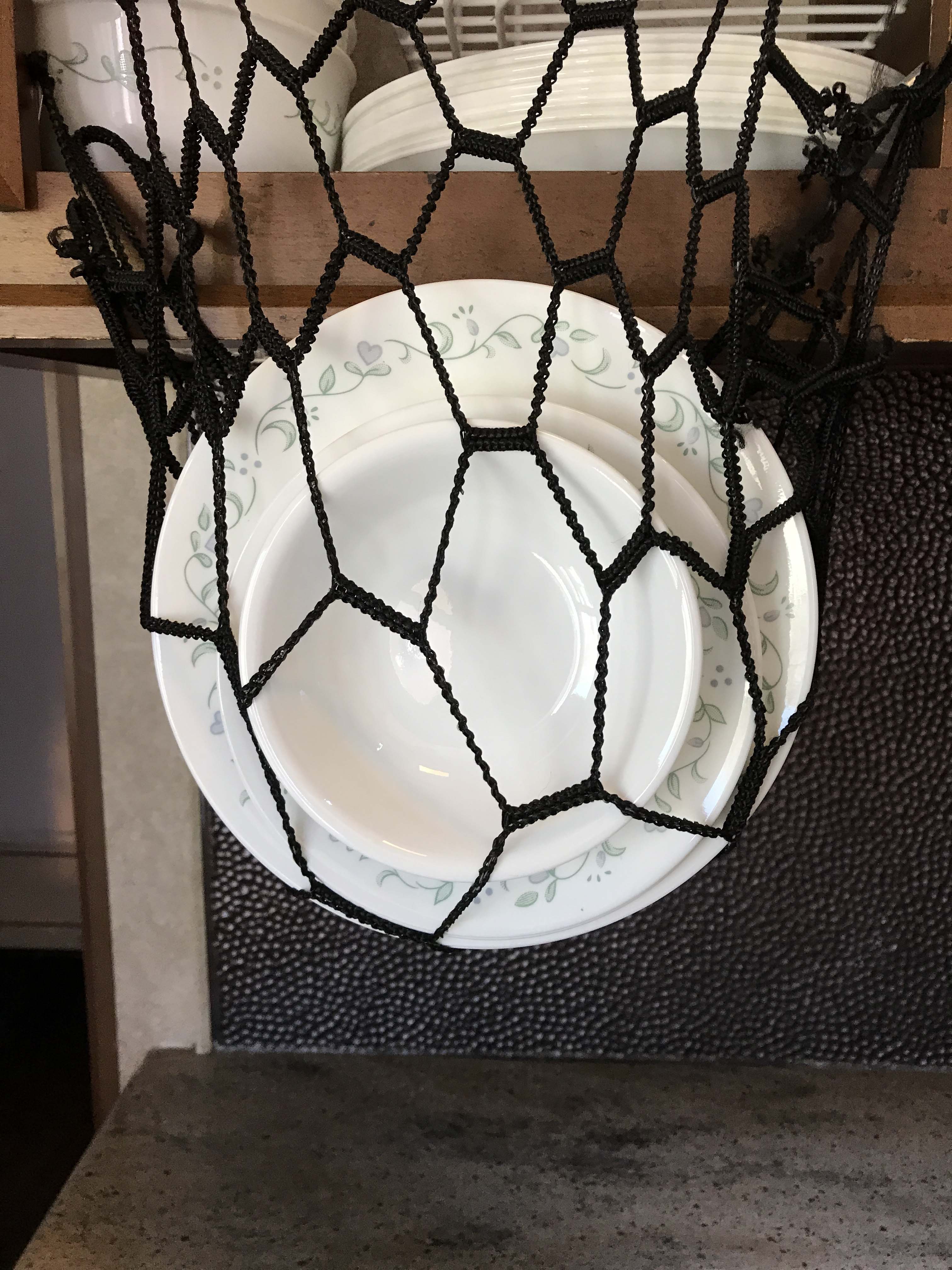 We found the road to be a little challenging. Part of that is because we don’t have four-wheel drive, but we also tend to baby our rig and most of the road was washboard which made it shake pretty violently. The other part was that it had some very steep (at least 9% grade) gullys and since those were at the end of curves, it required some acceleration for us to get up them. The last one our back tires were spinning a little in the gravel and sand, and Lee got very nervous. There are also a couple of very tight hairpins, and those are also at a pretty sharp angle, so there’s a lot of rig leaning going on. Going out we did much better though because we knew what we were in for, but going in was tough, and I really wished we had a second car so we could have driven it first. In case you think I am exagerating, when we stopped almost all the cupboard doors were open and a stack of dishes was caught in our netting. I dutifully put this netting up every time we travel, even though our cabinet doors rarely open, and I am thankful I did as you can see from the pictures.