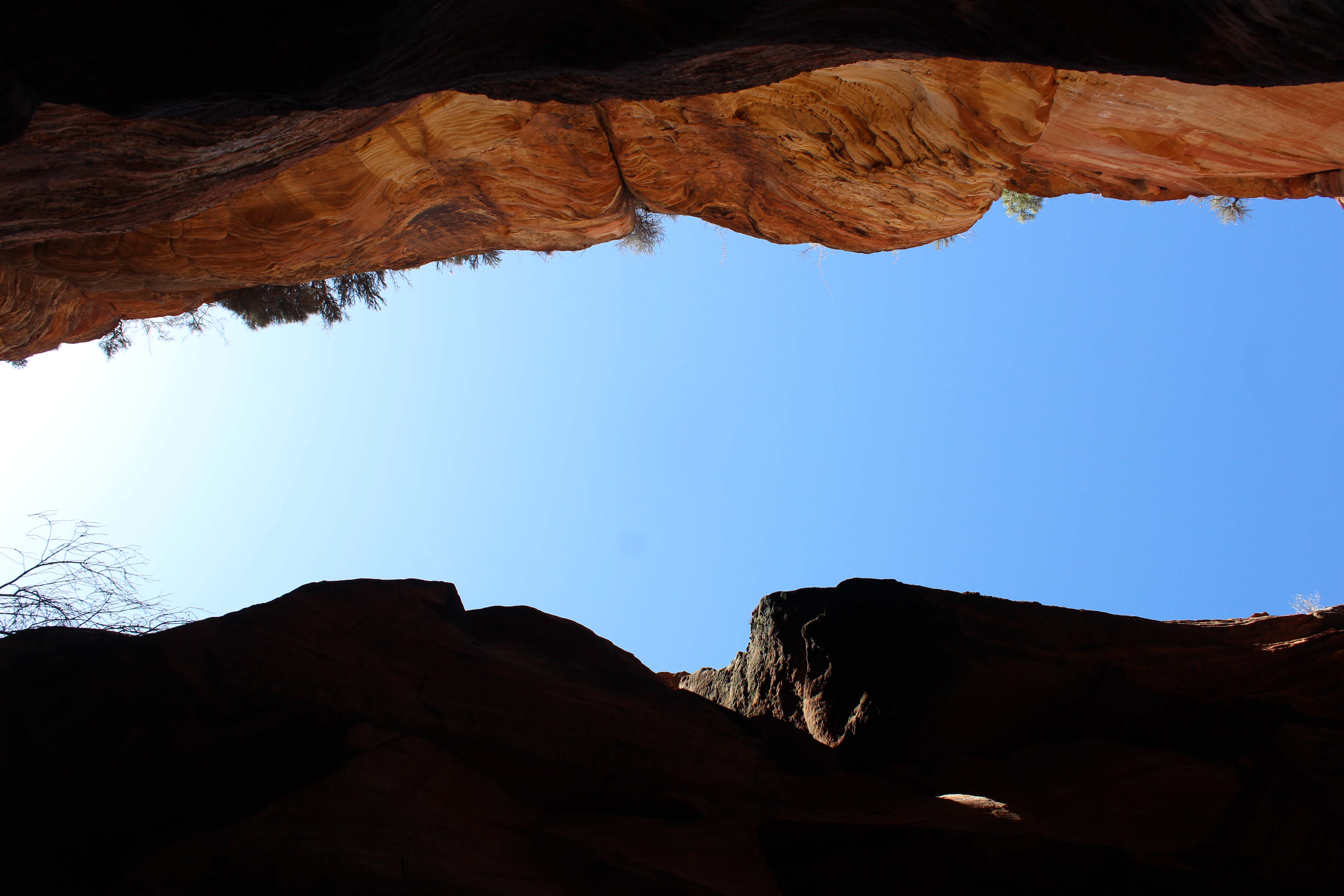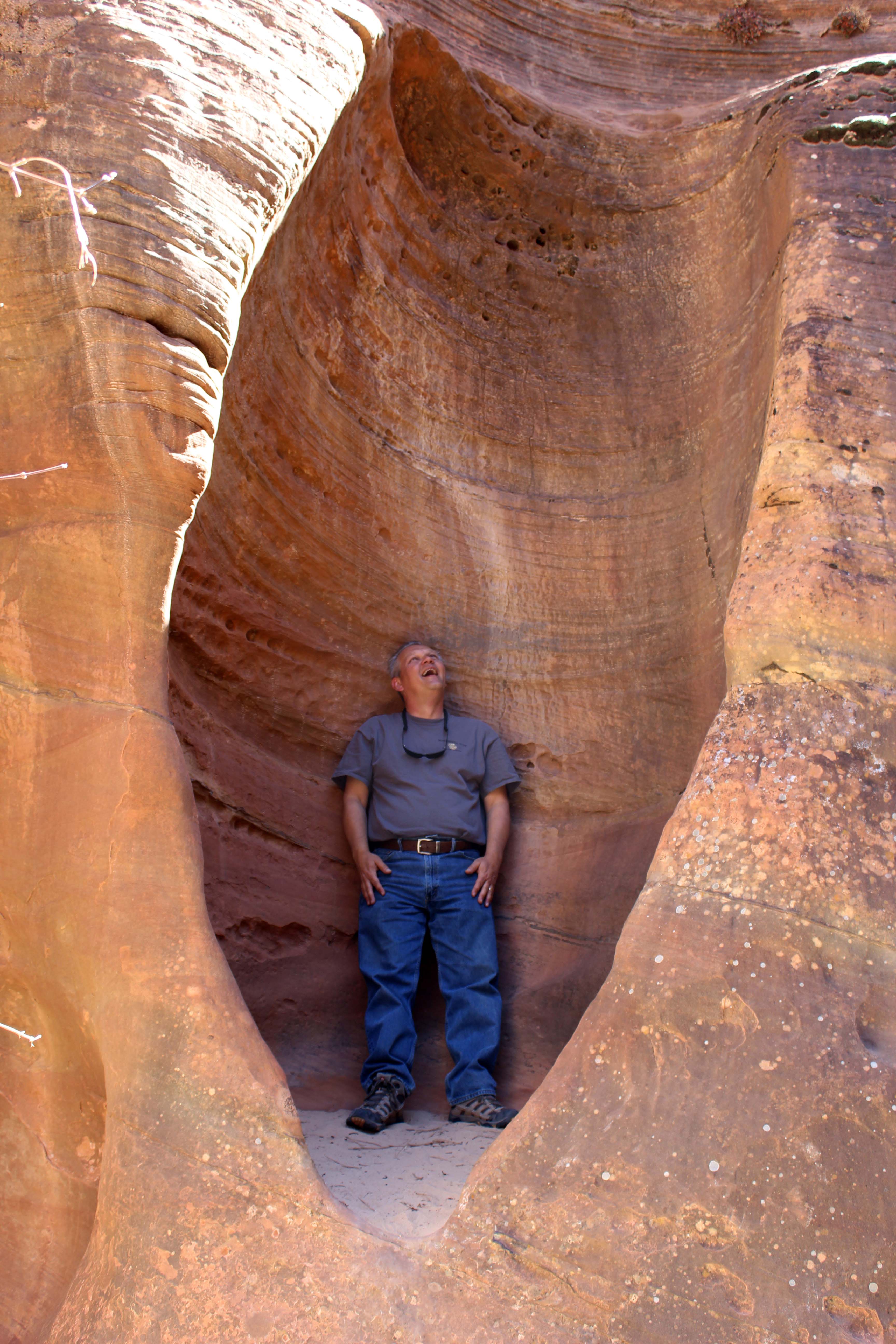 Our next stop was at the pit toilets at a large pullout, sorry that’s the best way to describe it, and we were looking at the rocks and decided to walk down a bit. Lee saw a dry creek bed and helped me down with my slippery shoes and it was a really neat dry riverbed canyon. My friends have been worried that I might get claustrophobic in the canyons, but I did just fine. The fact that there was no “ceiling” helped me quite a bit. It’s a good thing too because Lee loved walking in the canyon and I can see tons of these in my future. One important note here is it is VERY important you never walk in these if there is any possibility of rain. Flash floods kill people every year, so be very careful before entering.