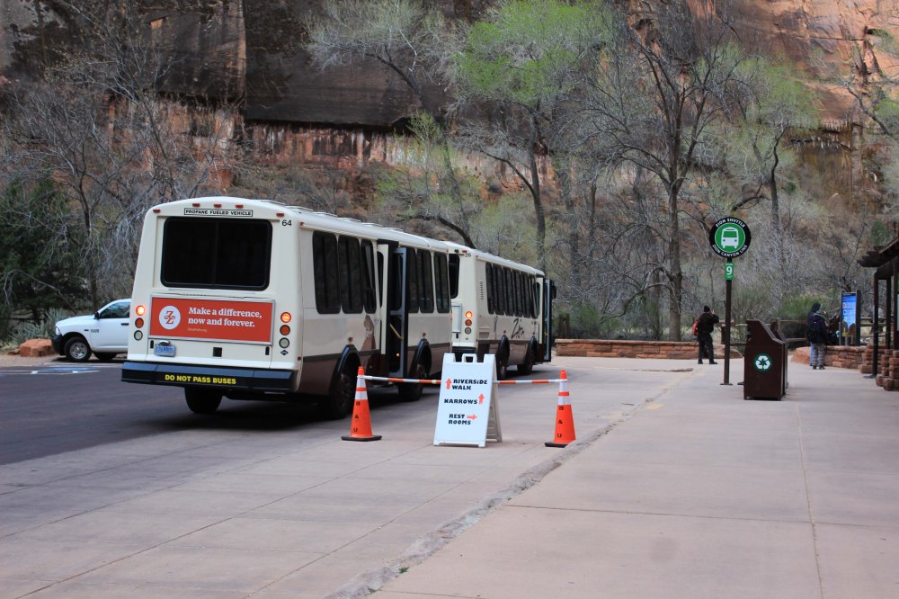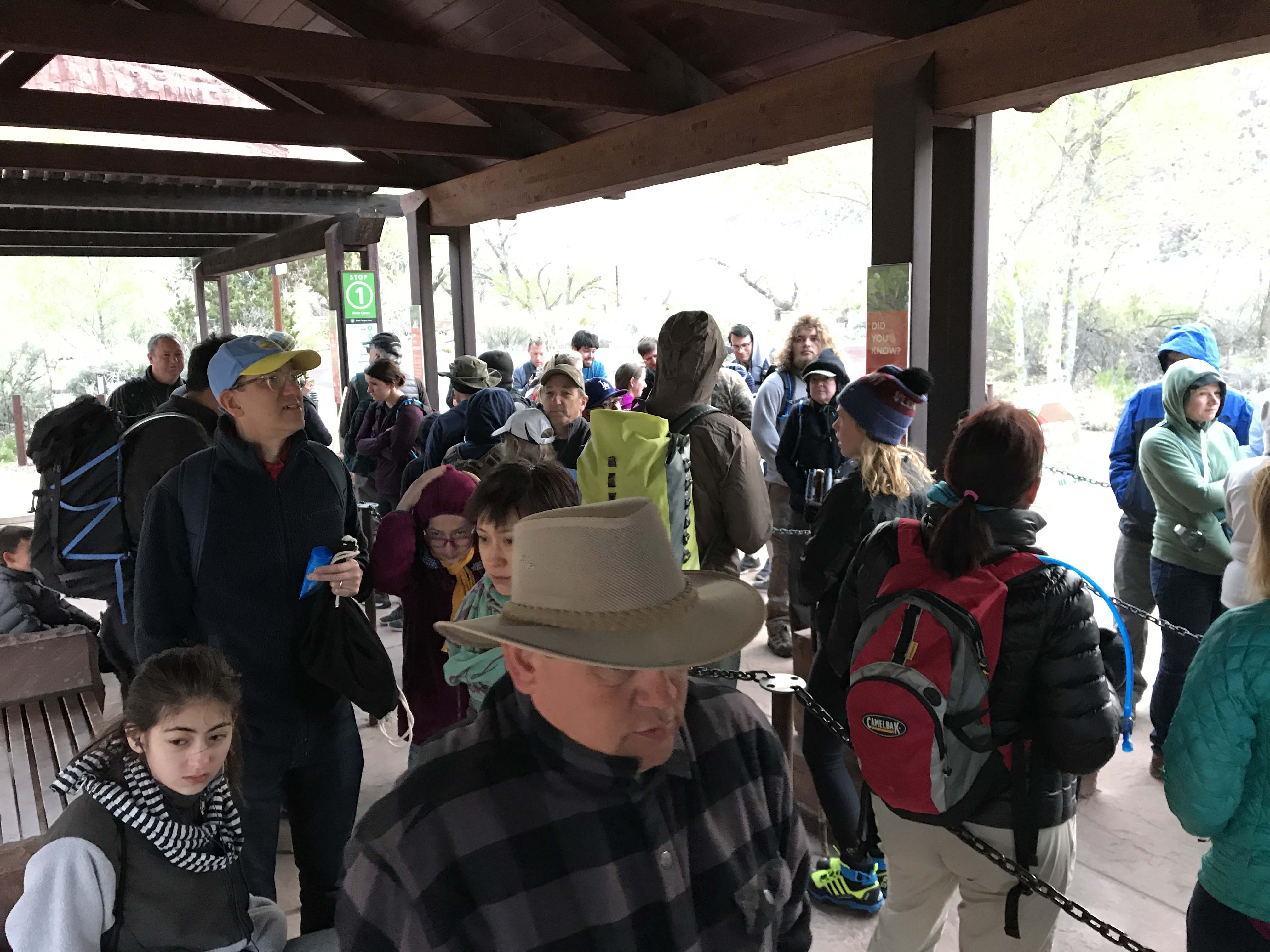 Geared up, we left the rig at 6:30am and were surprised when we were stopped by construction traffic for 14 minutes. They seem to be doing the work at night, and we caught the last of it as we tried to enter the park. The good news was the parking lot at the visitors center was only a third full when we arrived at 7:31 am, but there was already a decent line waiting for the bus. Surprisingly, a ton of people fit on each shuttle, and although we didn’t make the first one, we did catch the second and were in the warmth by 7:32am. I will say that if you decided to skip the line and drive up to one of the parking spaces by the first three stops I wouldn’t recommend it. The buses are full coming from the visitors center and unless someone gets off you are not getting on, so I don’t think that saved those folks any time.
