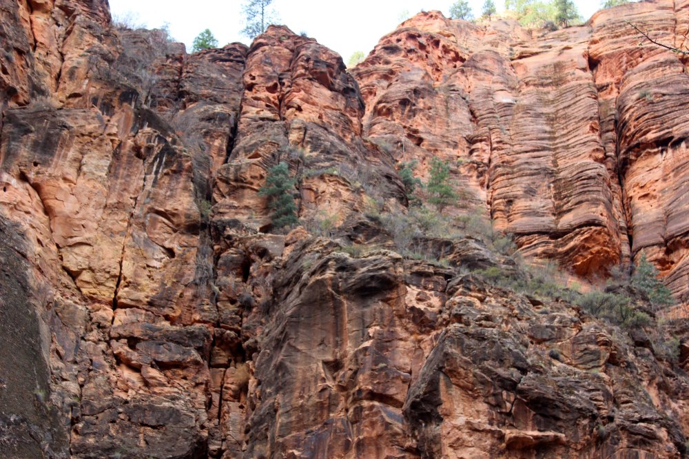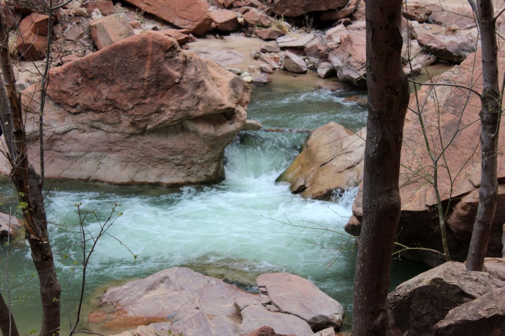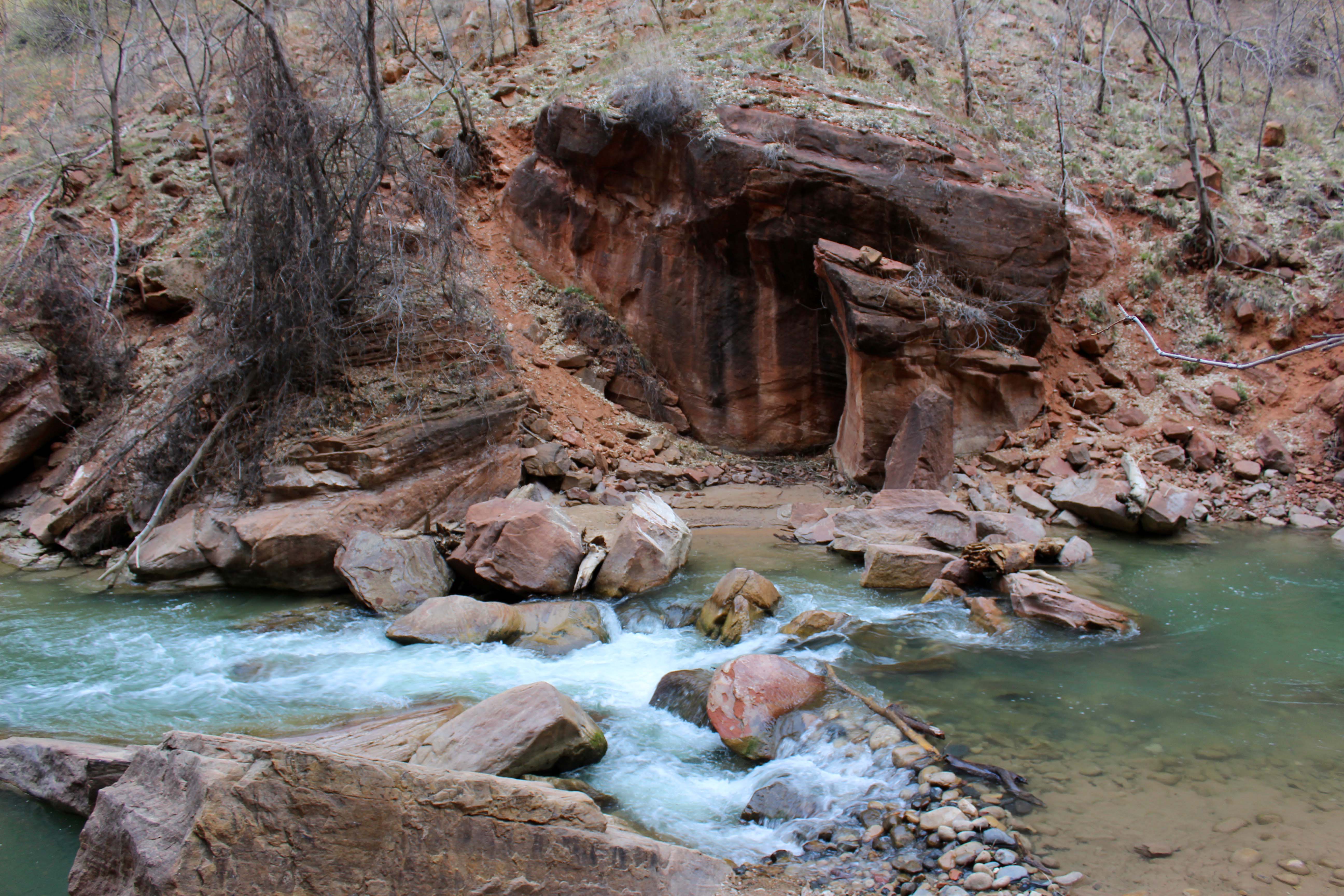 By the time we got to the Temple, it was 8:17am and the shuttle was only about a third full and we saw several small groups with rubber hiking shoes and wading gear. The Riverside walk is the entrance to the Narrows, which is a walk through the Virgin River along the canyon floor. That is a hike I would love to do in the future, because it looked really beautiful, but you definitely need special gear before you attempt it because the water is very cold. One of the nice things about the River walk is it has a little bit of everything. There are some small hanging gardens, being in a canyon, and a walk along a beautiful river which had some small waterfalls. We both loved it, and walked out on the paved path and chose to walk along the sandy shore during our return. It was chilly, and I was incredibly grateful for my gloves and earmuffs, but once we got back to the bus, I was able to take them off and leave them off for the rest of the day.