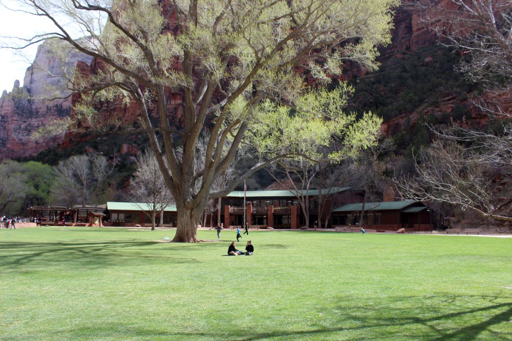 It was a great hike and I highly recommend it, but we weren’t done yet. Our plan was to stop at most of the stops on the way down and take some pictures, and as advertised it was VERY easy to get a seat on the returning bus. Most of the traffic was going the other way, so we were able to both get window seats and enjoy the view. Our next major stop was the Zion Lodge and on a whim we decided to get breakfast. The Red River Grill was almost empty at 10am and the breakfast at $10.75 (eggs, bacon, sausage, toast and hashbrowns) was very reasonably priced considering where we were, and the view. The service was pretty poor but the food was good and we loved the view from our table. The wait staff told us the line was out the door for lunch and dinner, so we were happy to experience it without fighting any crowd. Plus the lodge itself is really pretty, nestled in the rocks, and is the trail head for the Lower Emerald Pool Hike.