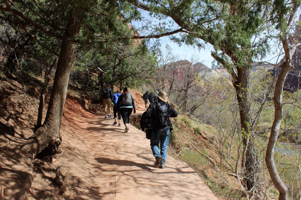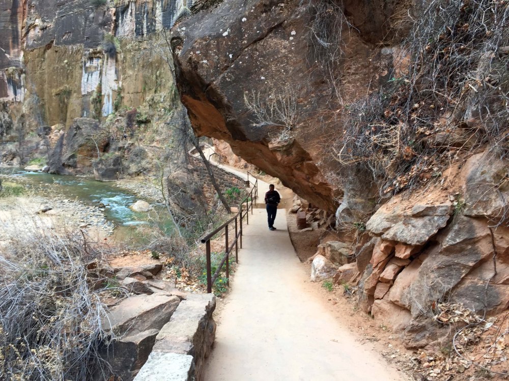 The shuttle bus has nine stops, and we were riding it all the way to the Temple of Sinawava at the end with the intention of doing the Riverside Walk trail. There is some audio information at every stop, narrated by a variety of people, and the heating system on the bus worked great. We enjoyed the ride and looking out the large windows, and I would recommend it even if you didn’t want to do any of the hikes. About half of the people (most of the younger kids) got off at Angels Landing, which is a very difficult trail with a 1,488 foot elevation change and steep, narrow drop-offs. Elevation change is something we pay particular attention to, because neither one of us likes steep hiking. The Riverwalk was perfect for us, because it was 2.2 miles round trip and only had a 57 foot elevation changed. It was also a paved trail and wheelchair accessible which is always a good sign for us. As a general rule we know we can handle any trail that is wheelchair accessible and I like paved trails, because I can focus on the scenery as I walk rather than looking down at my feet.