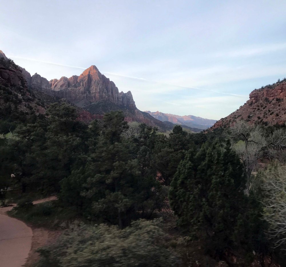 Coming down from the pools was much easier and again we had no issue getting on a shuttle bus. Since the bus was mostly empty we could both take pictures out of the window and many of them turned out really good. Our next stop was the Court of the Patriarchs and walked up a very steep path to a small viewing area where you can see all three of them. They were named for old testament patriarchs and were really beautiful and I would imagine a great place to watch the sun rise.