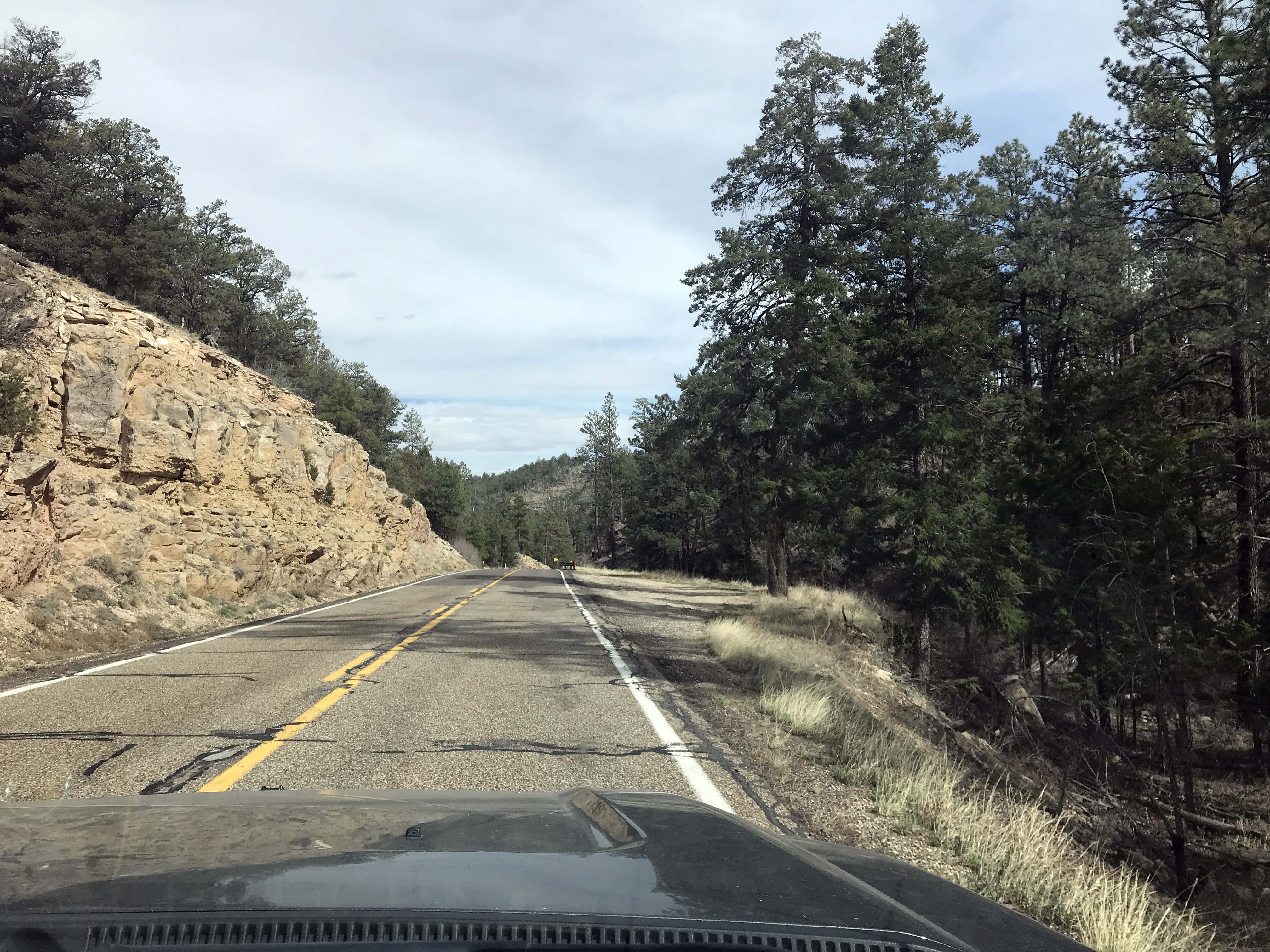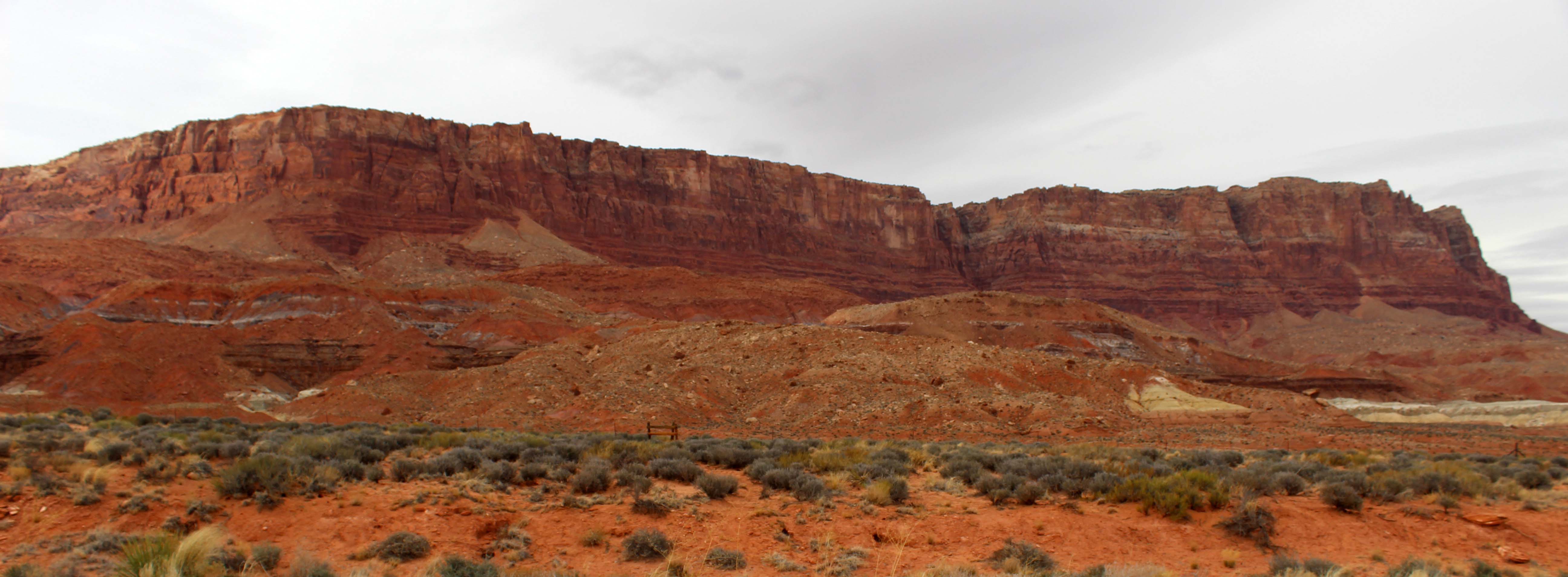 After getting information we headed onto 89A to see what we could do for free in the area. I’ll be honest, the first part of the drive wasn’t very scenic and I was definitely wondering what all the fuss was about. It got a little better when we hit the Kaibab National Forest and stopped at Le Fevre overlook for a scenic view. This landscape though was much like others we had seen before around Flagstaff and we were looking for something more unique. The temperature did drop 15 degrees when we hit 7,000 feet and we saw the sign for the Grand Canyon North Rim but it was still closed for the winter. Not sure why, since there were only tiny patches of snow left, but we kept on driving and eventually headed back to lower elevation. Lee did like the road very much, and coming down he said it looked like a car commercial, and then as soon as we left Kaibab we entered another section of The Vermillion Cliffs Monument.