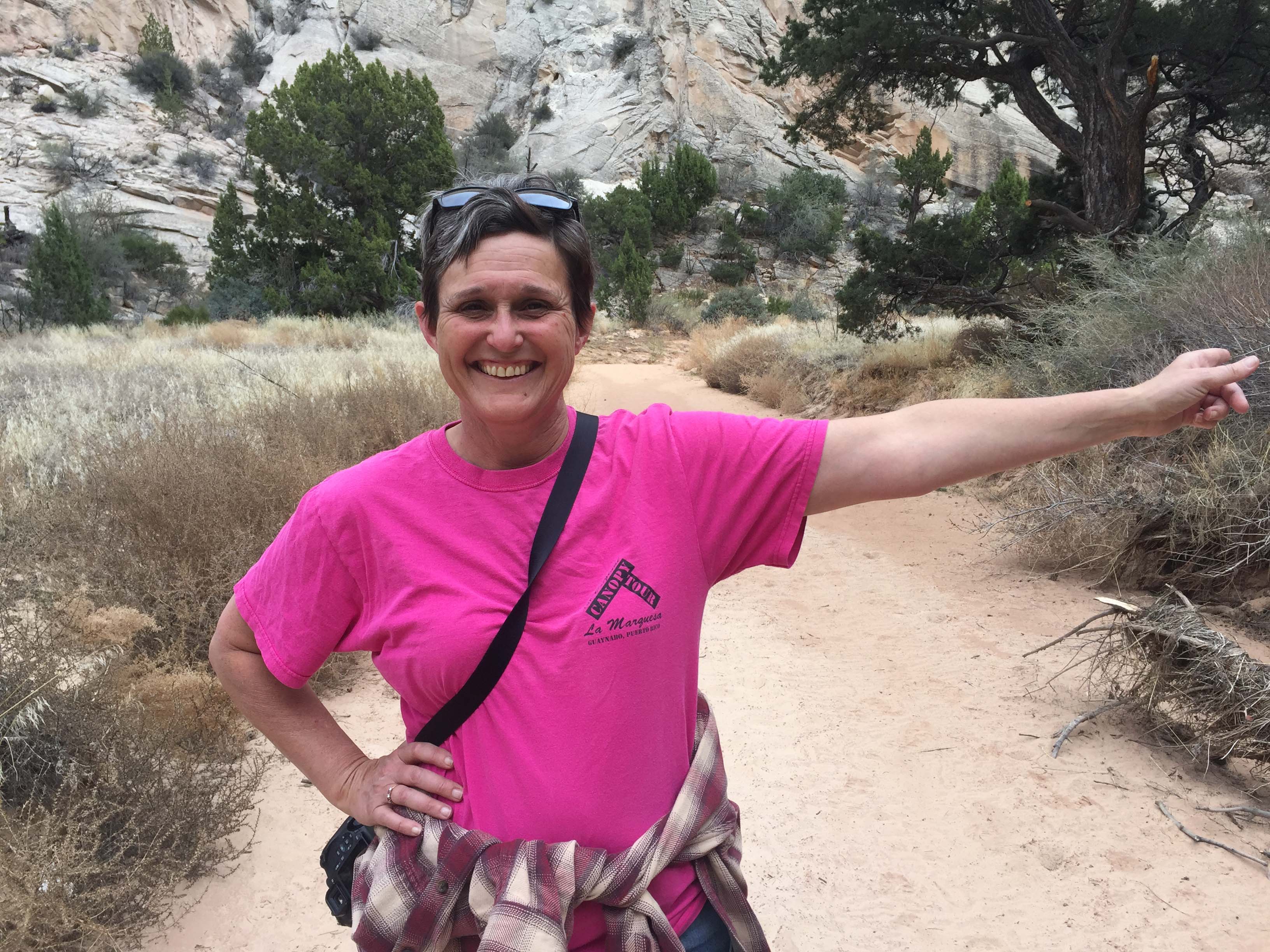 There was a turnoff to the left about a half mile in that led to an amazing slot that was a dead end. Lee took my picture pointing to the way back to the entrance which I thought was really smart