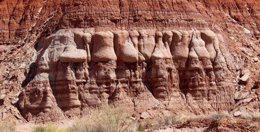 Once we got back to the left we found what we thought was the path and started watching for trail markers. There are more of them the closer you get to the Toadstools, but in the beginning it was still a bit confusing. Plus the path is quite a bit steeper than I expected, staying out of the wash (which was good because it was a little muddy), but also going up and down several little hills. Finally we turned a corner and could clearly see the major toadstool formation and we saw the steepish climb that was required at the end. At this point I was more tired than I expected to be and was dreading that climb a little bit, but since we saw many people older than us walking the trail, I took a few deep breaths and we kept going.