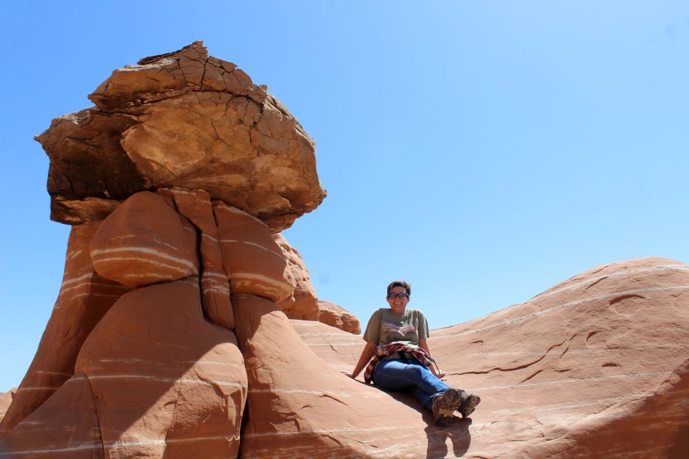 The Toadstool Hike trailhead is right off of 89 and is roughly in the middle between Kanab and Page. It is a 1.5 mile round trip hike, up to a plateau with Toadstool shaped rocks. Since our friend Cori had recommended the hike I was eager to go, but once again I underestimated how rough the terrain would be, and left my hiking poles at home. The trip started out OK, with a relatively big parking lot and a nice flat walk to the toadstools which we could see in the distance. The problem was the initial trail was a little washed out and although walking on the dirt was just fine we weren’t 100% which way to go and ended up veering right when we should have stayed to the left. That little walk was actually really pretty (the colors really popped after the storm washed the dust off of things the previous night), but we kept moving away from where I knew the rocks were, and after about a half mile I told Lee I wasn’t going any further in that direction and we had to turn around.
