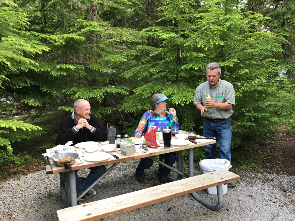 Tuesday we had to work, so Linda took it easy trying to recover from the cold, but found time to finish a latch hook project I had started at the reunion rally and never had time to finish. When I came to see her after work, it was completely done, which was lovely since it probably would have taken me weeks to finish it. I’m just not very crafty. Howard took advantage of the time and hiked the 13 mile trail around Timothy Lake. I was really glad to hear that he thought the trail was in good condition and I could tell he really enjoyed himself from the big smile on his face when we walked back. I was on call Tuesday night, so we hung out at their site and had a cheese plate that Linda put together, then we all called it an early night with plans to paddle Trillium Lake early the next morning.