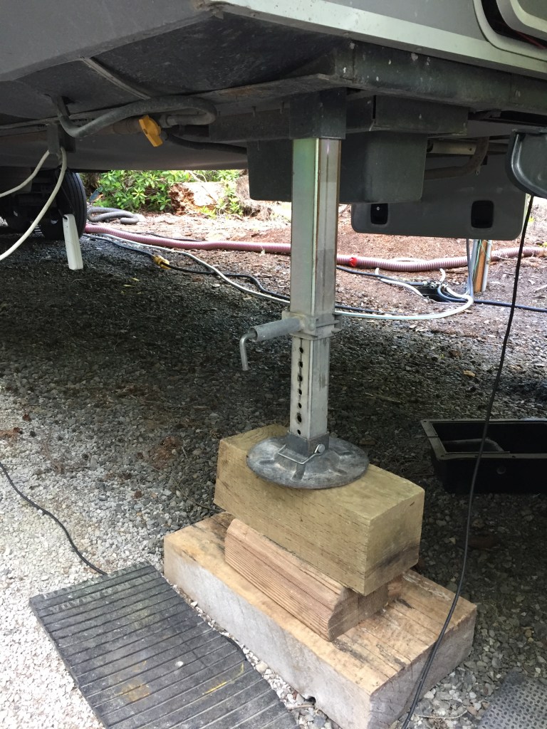 At our current location, we’re on a very unlevel site. The front of the site is VERY low, and so in order to get level I had to raise the front of the rig up A LOT.