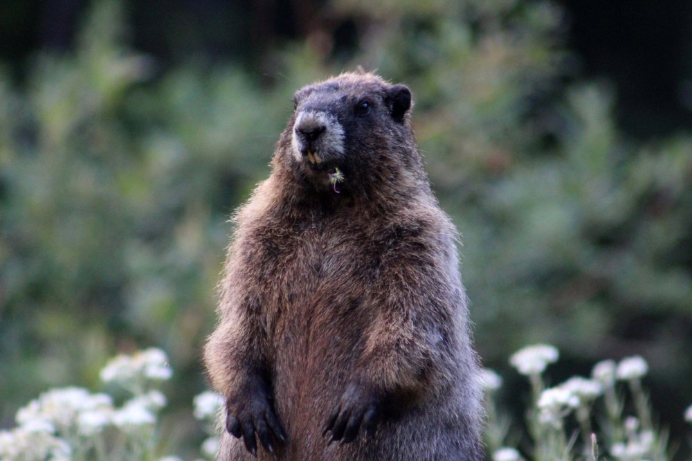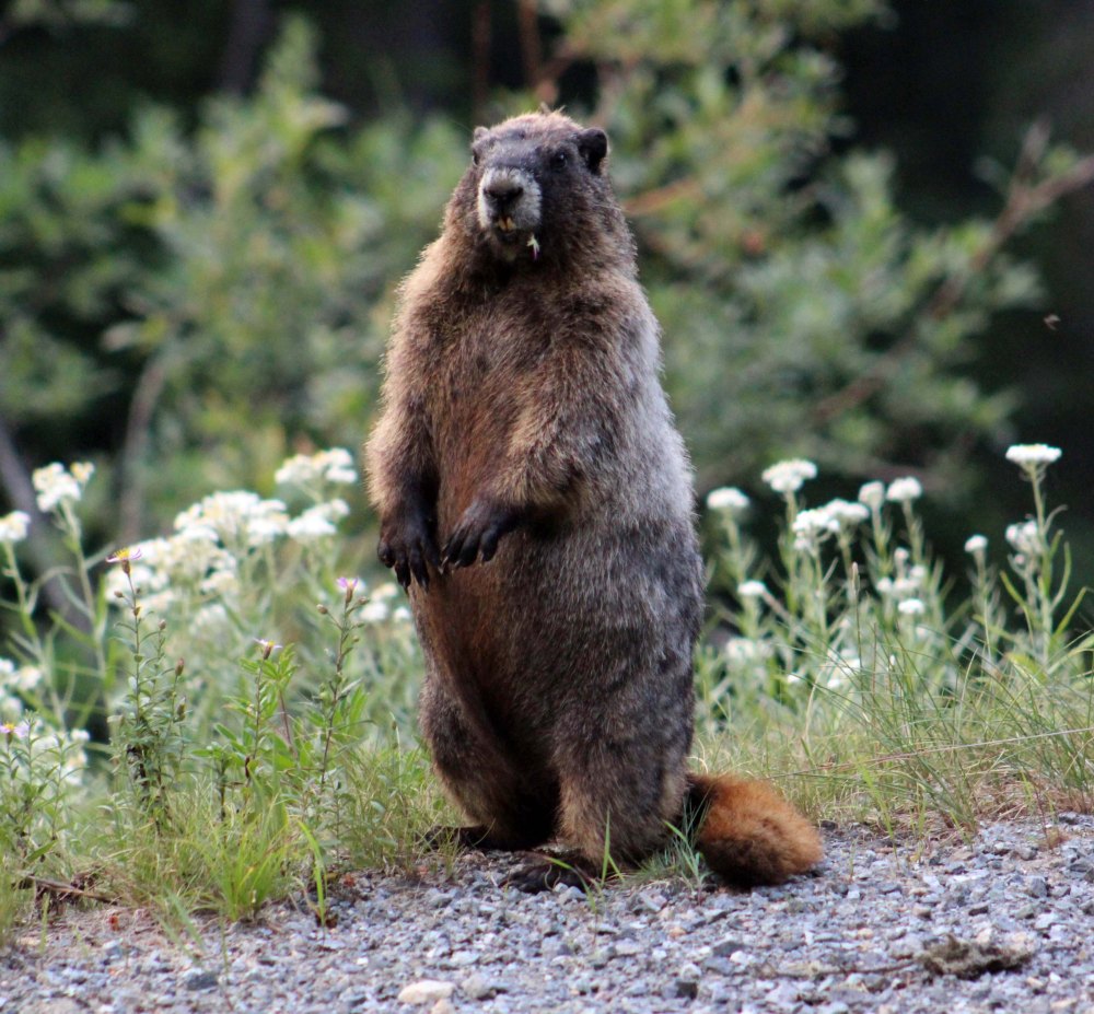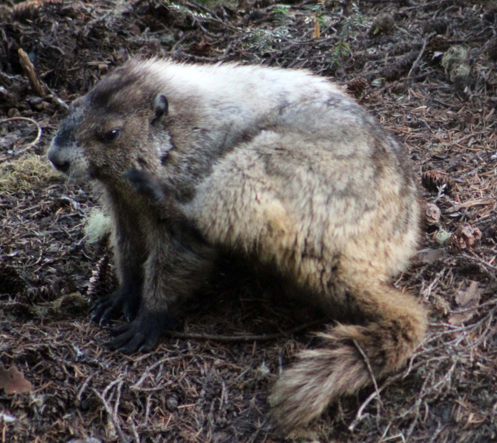 After the wonderful waterfalls, we decided to go up to Paradise Inn and eat some dinner.  We knew it would be pricey, historic lodges generally are, but splurging for a birthday dinner seemed like an OK thing.   And I am so glad we did, because there was construction going on and we missed our turn into the parking lot which took us on a one way loop away from the lodge, and back down the hill to where we started when we headed up to the lodge. Lee stopped the car rather suddenly and asked for the camera, and started taking pictures of a hoary marmot.  These guys are about as big as a ground hog and the only other place we had seen them was Alaska.  The first little guy posed for me for a really long time to my delight and then a second one was on Lee’s side and stood up for him and he got some really great shots.
