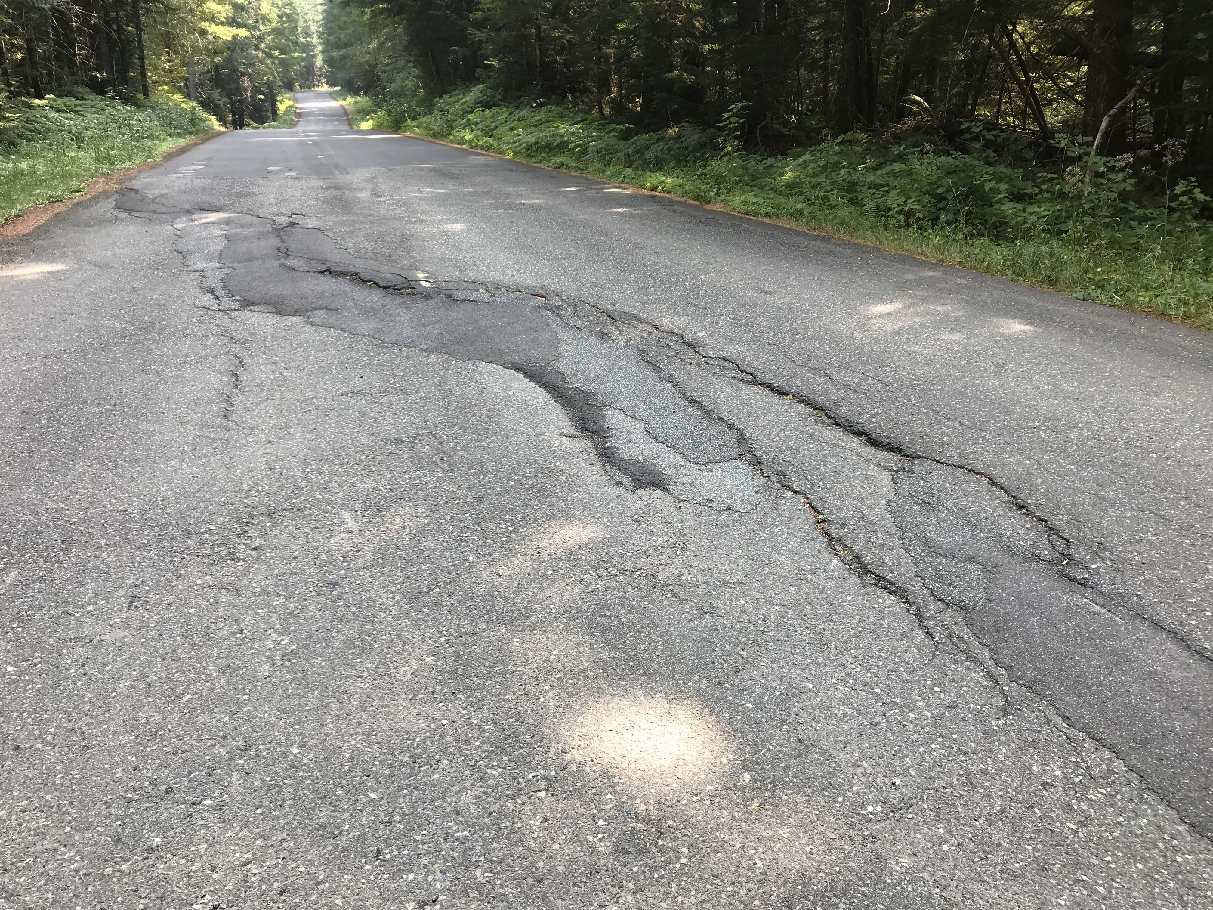 Now this is where it got dicey.  90 ran east/west and although my map had some thin road lines on it, none of them told us the name of the road.  So I truly had no idea where this road would eventually end up, and more importantly didn’t know what road to take to go north again. 90 was in even worst shape than 24 was, and Lee started to dodge some serious potholes.  More important than that, entire sections of the highway had “sunk” and despite his best efforts it was impossible to miss them all.