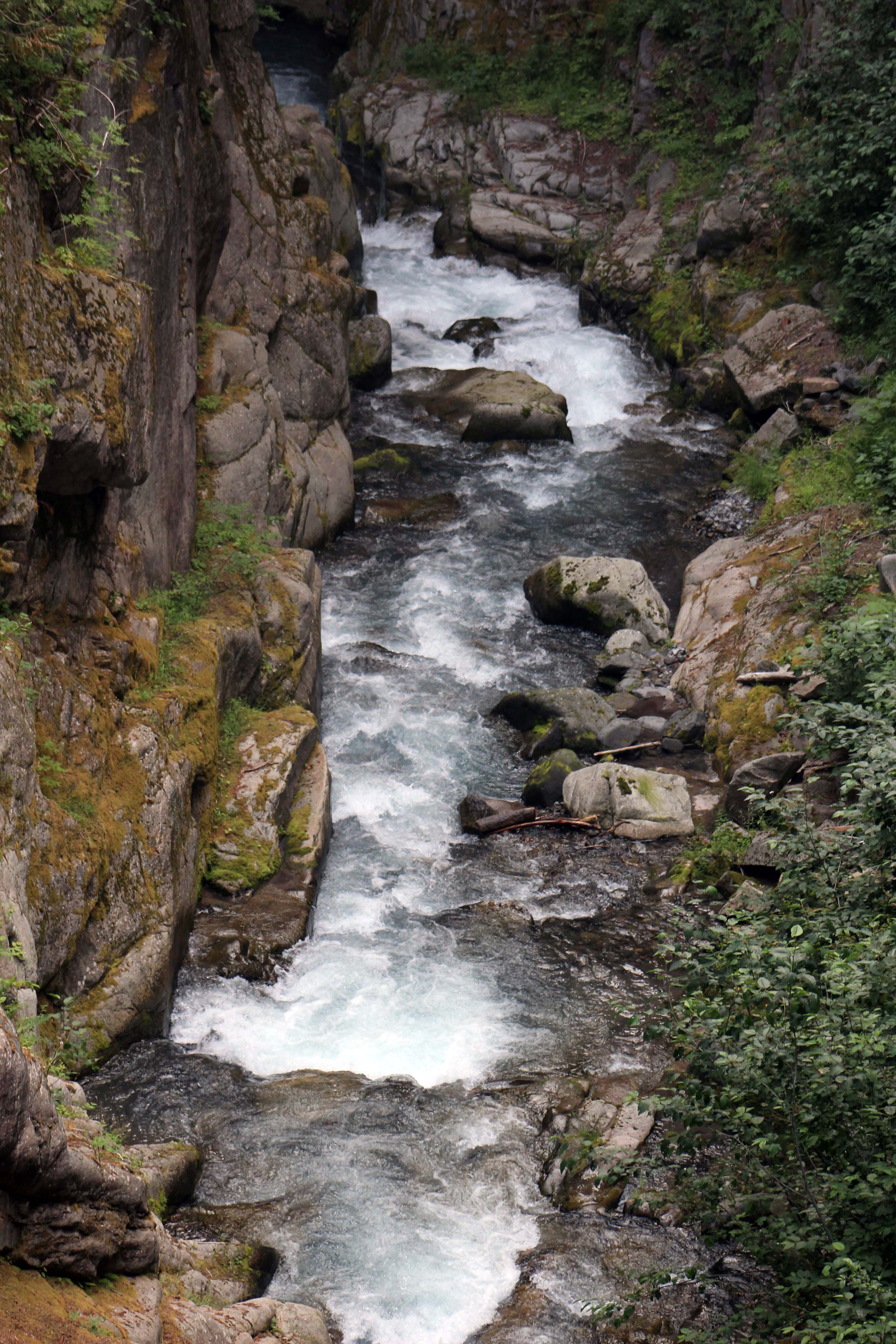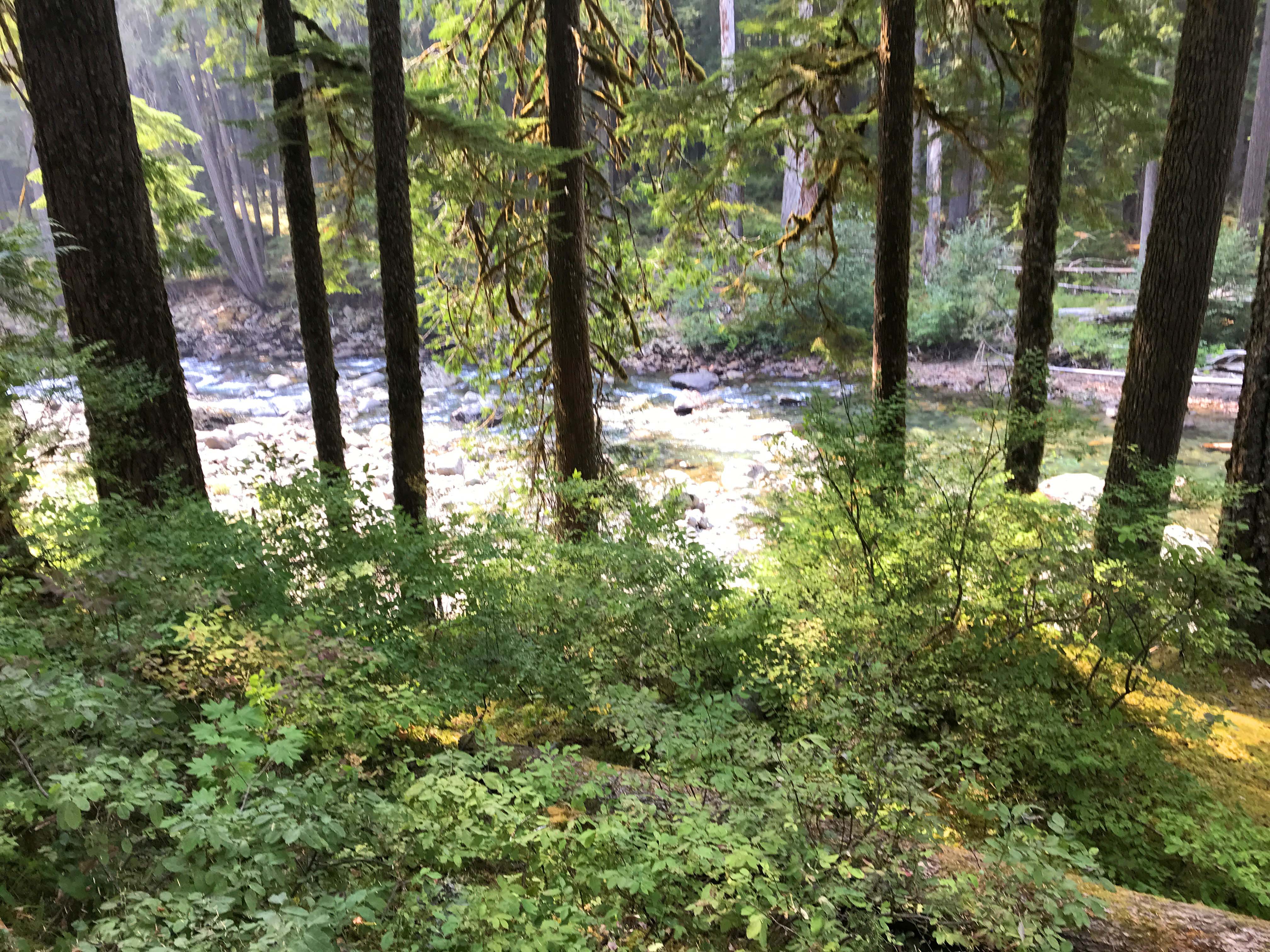 Despite my darkening mood, I couldn’t help but fall in love with the campsite.  #16 is on Ohanapecosh river and we even had a dirt path we could use to walk down to the river bed.  It was a huge site, very deep, with a place close to the water we could pitch our tent.  Really great site and the fact that it was only available for that one night made a ton of sense to me.  It was in Loop A which was a generator free loop, and they had bear boxes for food at every site, which was a great feature.  My only complaint was the restrooms, which were very dirty and didn’t include any paper towels for drying your hands, or soap in the dispensers.