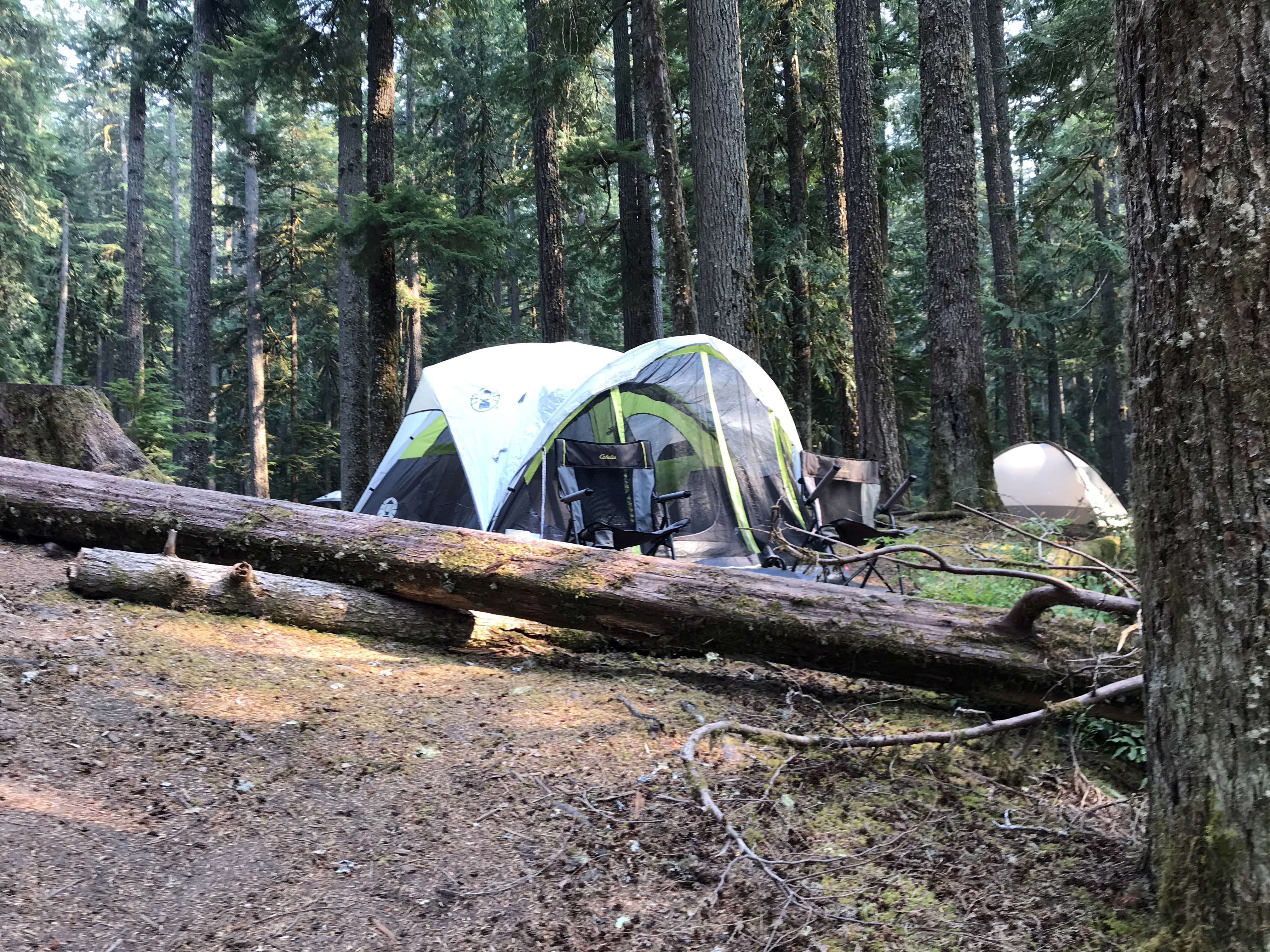 Once we turned onto 25 we both started to feel better, but then we started to see the smoke.  We’ve been really lucky at Timothy Lake this year with not many really bad smoky days, but the valley  leading into Ranier was was full of it.  There were lots of pull-offs and what we assume were spectacular views but we couldn’t see any of it. At this point I started to get really bummed out, because the weather report for Ranier had shown clear skies and there was no mention of smoke at all.  Eventually we made it to our campground. Ohanapecosh, and went into the Visitors center.  We met a very nice ranger who told us that unfortunately there was a fire ban (again not on the website anywhere before we took off and I read their twitter feed!), but I wasn’t too terribly disappointed because just in case we brought our new Bond Mfg 66603 Aurora Portable Gas Steel Fire Bowl, 18.5″, BlackThe smoke was a larger concern, and at that point I was tired and just wanted to get into the campsite and eat some lunch.