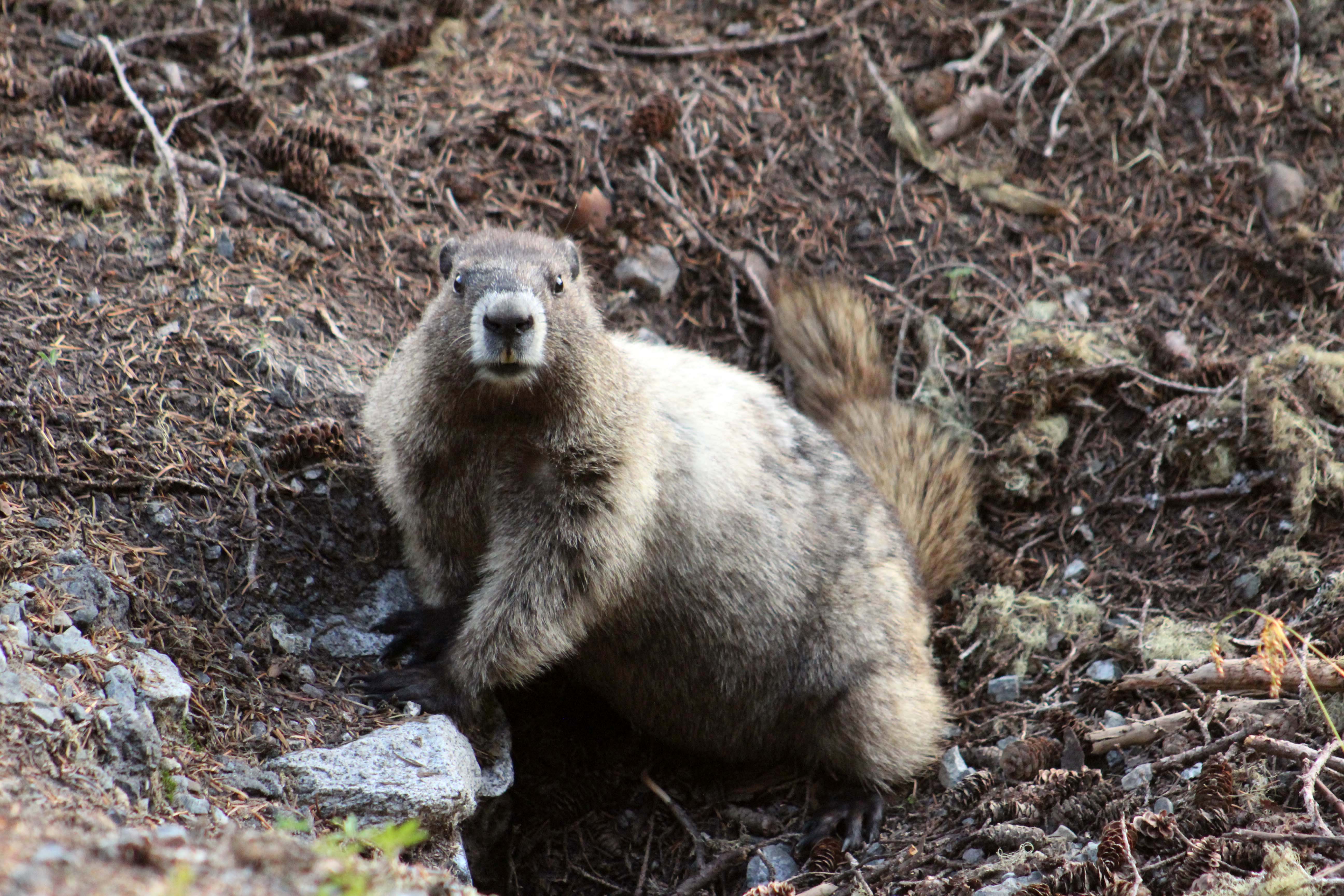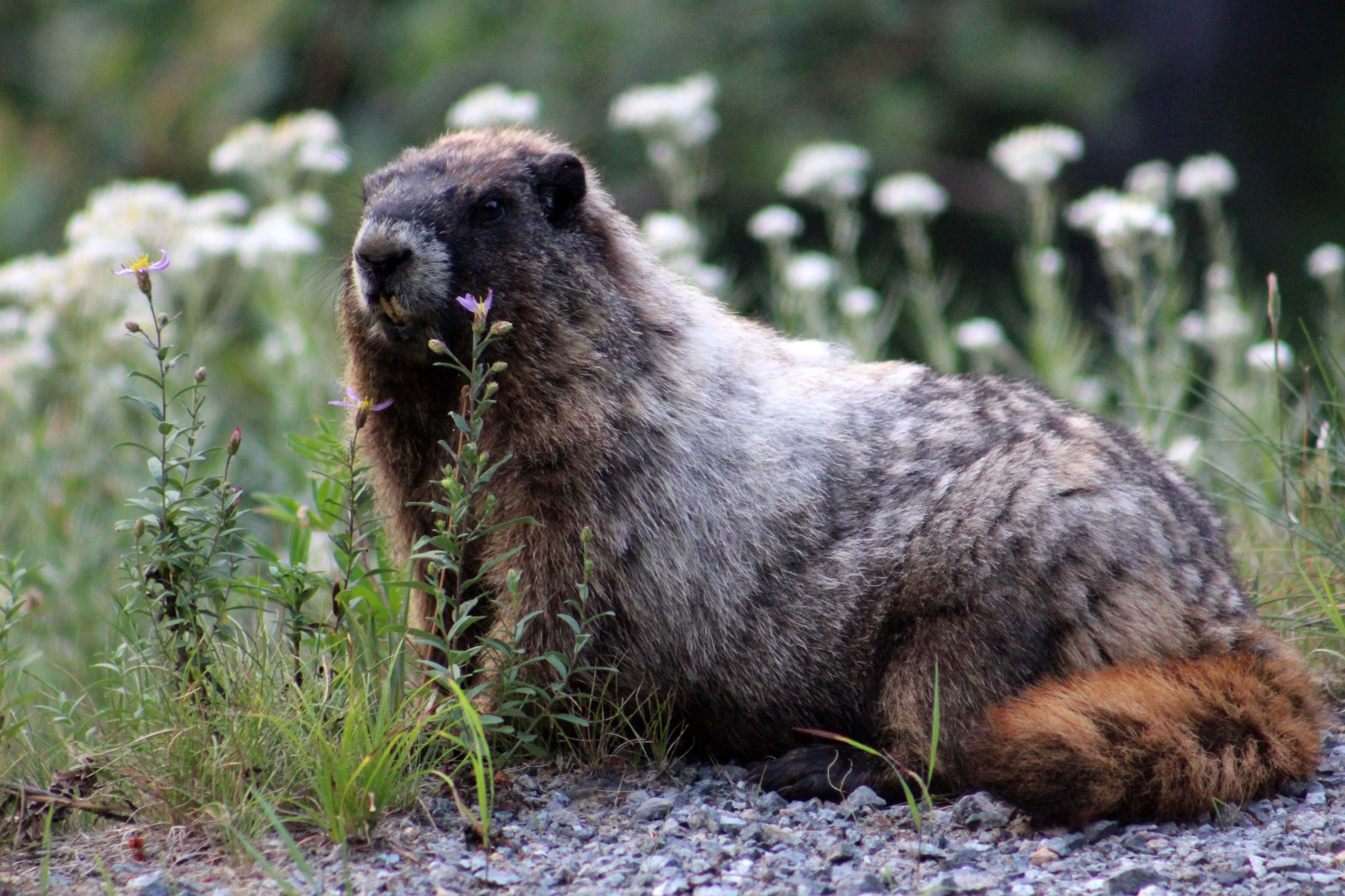 After the wonderful waterfalls, we decided to go up to Paradise Inn and eat some dinner.  We knew it would be pricey, historic lodges generally are, but splurging for a birthday dinner seemed like an OK thing.   And I am so glad we did, because there was construction going on and we missed our turn into the parking lot which took us on a one way loop away from the lodge, and back down the hill to where we started when we headed up to the lodge. Lee stopped the car rather suddenly and asked for the camera, and started taking pictures of a hoary marmot.  These guys are about as big as a ground hog and the only other place we had seen them was Alaska.  The first little guy posed for me for a really long time to my delight and then a second one was on Lee’s side and stood up for him and he got some really great shots.