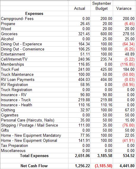 New Equipment – We went over by $20 in this category purchasing items we needed for our upcoming move. Lee completed a purge, which was nice, and in the process found some items missing or broken that needed to be replaced. Since we are in a spot where we can receive mail we decided to take advantage of that.