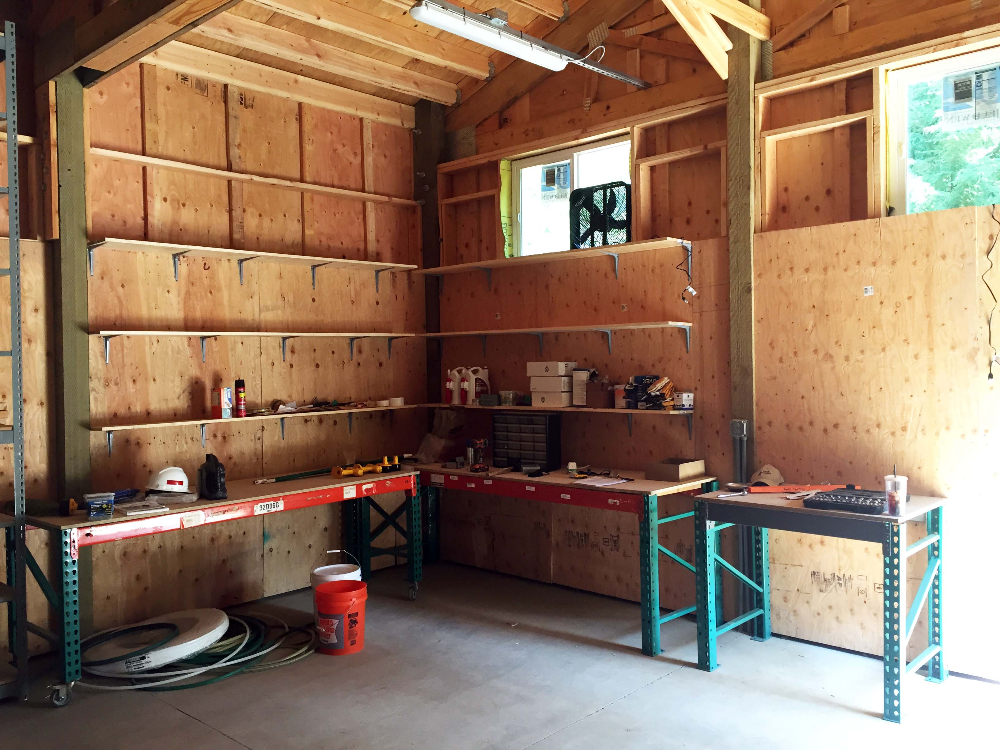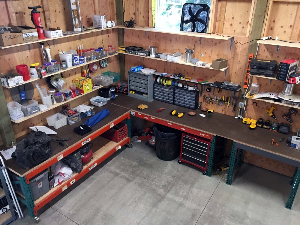 The last couple of weeks have been really, really, really quiet here and we have had plenty of time to relax and recoup. (Seriously, I have gotten in the habit of turning off my walkie talkie and turning it back on again because sometimes an entire day can go by with nothing happening. At all. Which is just creepy and weird. – Lee) Because Lee likes to stay busy he has spent most of his time finishing up the new workshop so I wanted to take a moment and talk a bit about that. When we first arrived we saw the beginnings of a brand new workshop and over the early part of the season it took shape. Designing the inside was a bit of a challenge, but something Lee was super excited about, and since no one else really wanted to do it he made it his season long project. He talked to all the stakeholders, did 3D CAD drawings, got approval for the design, and ordered custom shelving. Then he assembled the shelves, arranged everything, and really turned it into a beautiful place to work. Everyone was super impressed, myself included, and he wouldn’t let me take pictures until yesterday when it was done. So here is what he did, and I am super proud of him. (Aww shucks, ma’am. Tweren’t nothin. I just figure out where things want to be, and then put them there. Since we at this location last summer, I had no idea just how bad the old workshop/shed was. When we got here, I saw it for the first time. It’s an old building, about 10’x20′, and has been in use as the tool shed for a very long time. As a seasonal place, everything is closed down each winter, and although some people return year over year, there’s also a lot of turnover. So there’s a bizarre mixture of influences on how things were stored and placed inside. There’s also a LOT of stuff in there. The shop is used to store supplies for the lodge, and for the hosts of the individual campgrounds, and tools and parts and other supplies. And lots of stuff that only gets used once in a great while. Like most places like this, there was a lot in there that was leftover from many years ago, and some things that could easily be thrown away. When I first saw the inside my first thought was “This place needs to be cleaned and organized. But since I didn’t know what was useful and what was junk, I decided to wait. Plus, they were building a new shop right behind it, no point in doing the work twice. – Lee)