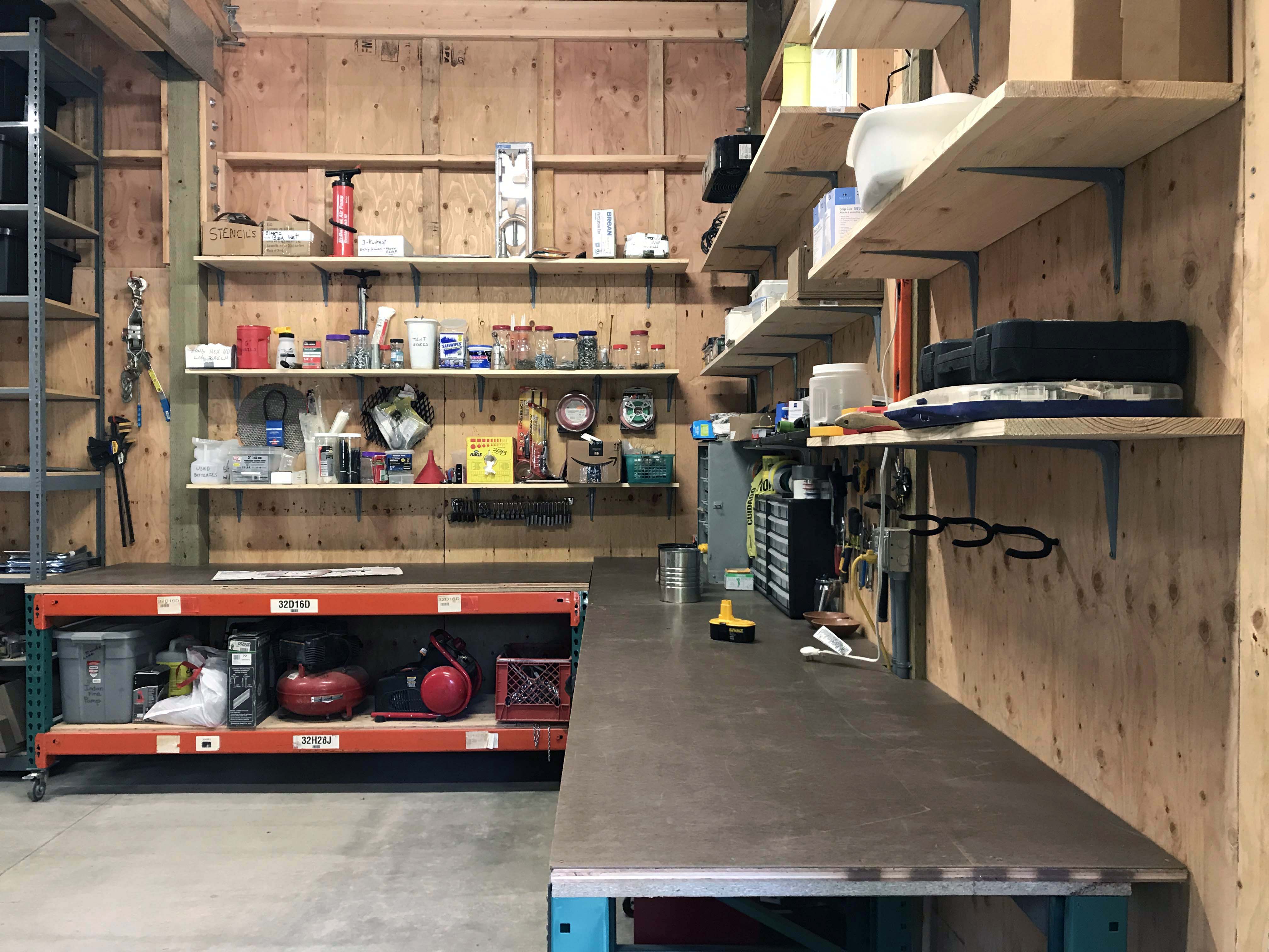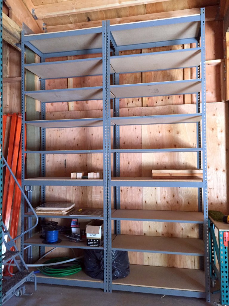 One of the things I definitely wanted to do was utilize as much of the vertical space as possible. With a 20′ peak, there was a LOT of space to work with, and since much of the stuff only needed to be touched once or twice a season, it made sense to get that stuff up and out of the way. I ended up going with two types of shelving, both bolt-less for ease of putting it together. For long span shelves and workbenches I used pallet racking. I ended up buying a mixture of new and used stuff from an industrial salvage company, and all of it ended up costing only about $1500, which is CHEAP! Here’s a panorama showing the entire “shop” side of the building, as opposed to the bay side. The shelves and pallet racking on the left already have some supplies because I wanted to be able to start using it right away to make sure everything would fit and see if what I had imagined would work in practice. The nice thing about the shelves on the left is that they are accessible from either side, so you can grab supplies from the “shop” side and use the man door, or you can pull a truck up to the garage door and grab stuff from there and put it right in the truck.
