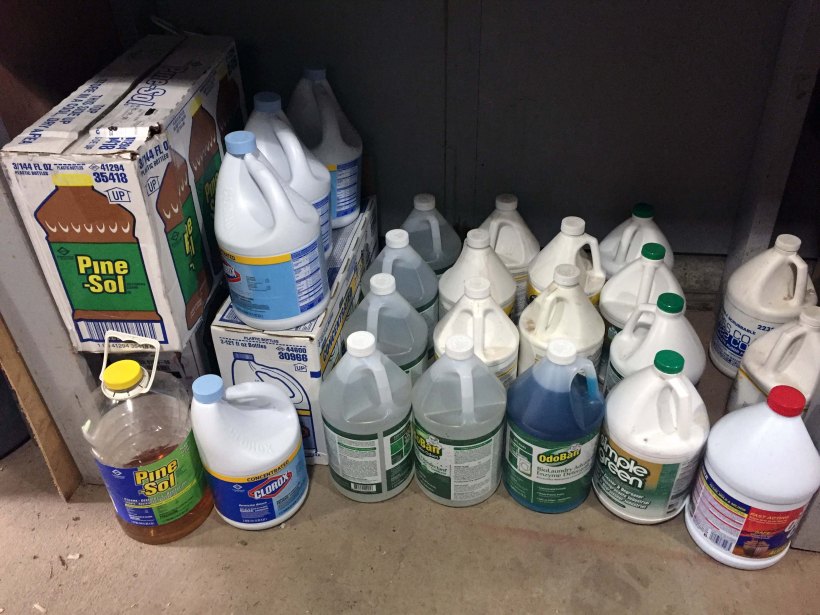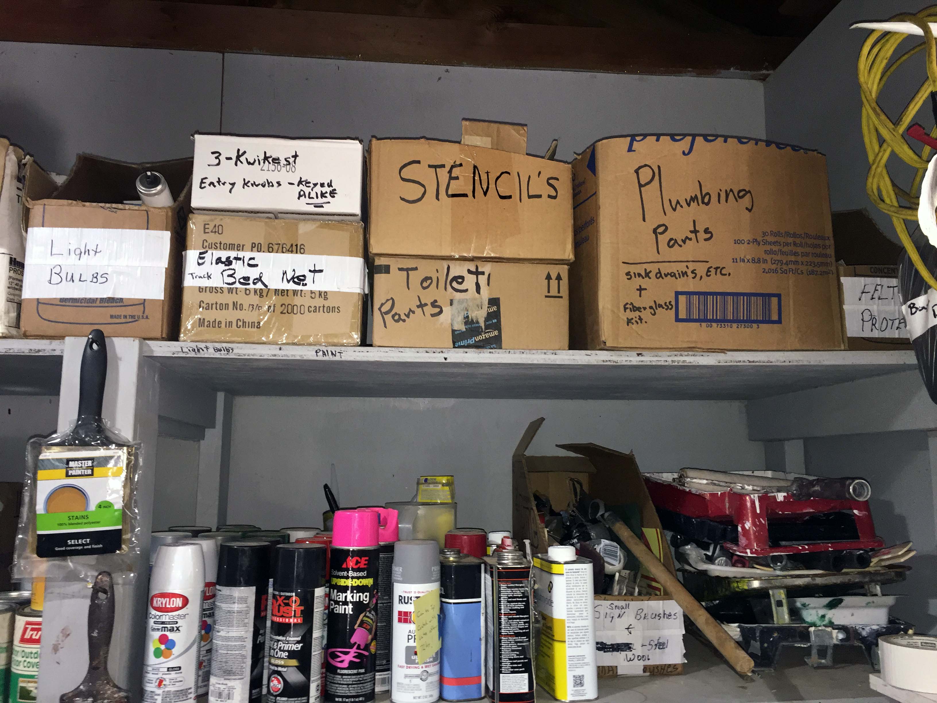 (Another good example of fighting for space. The boxes on the left are different sizes of gloves, which were delivered to hosts each week. But they were shoved to the back of a shelf, and had to be rooted out weekly. Annoying. – Lee)