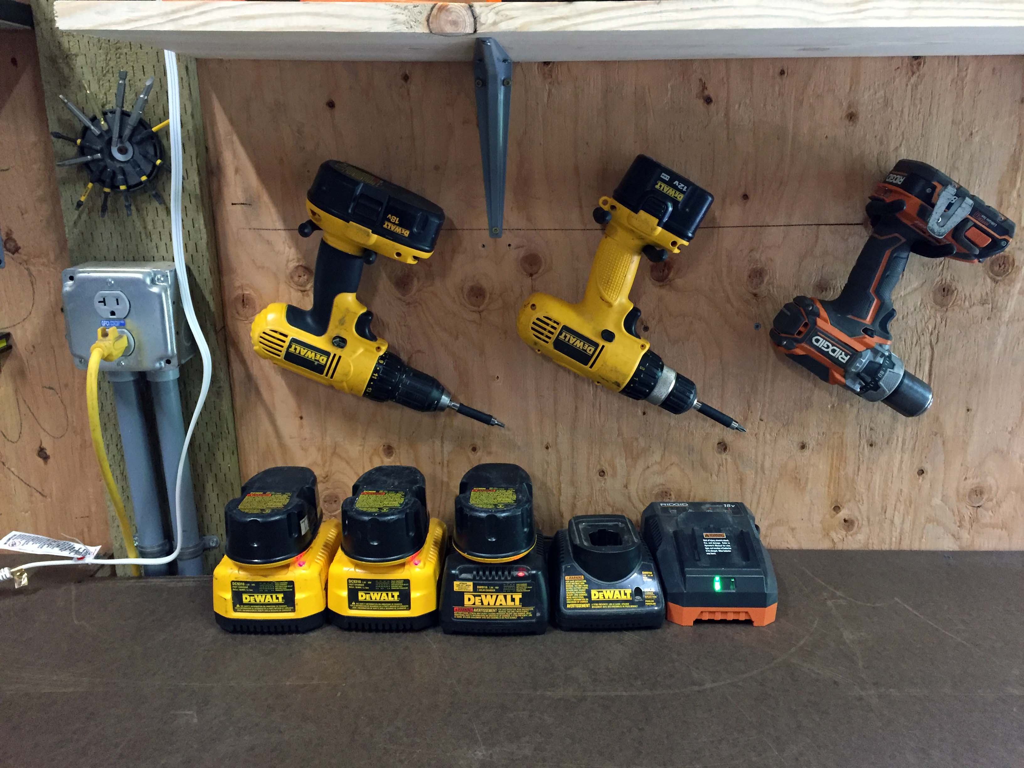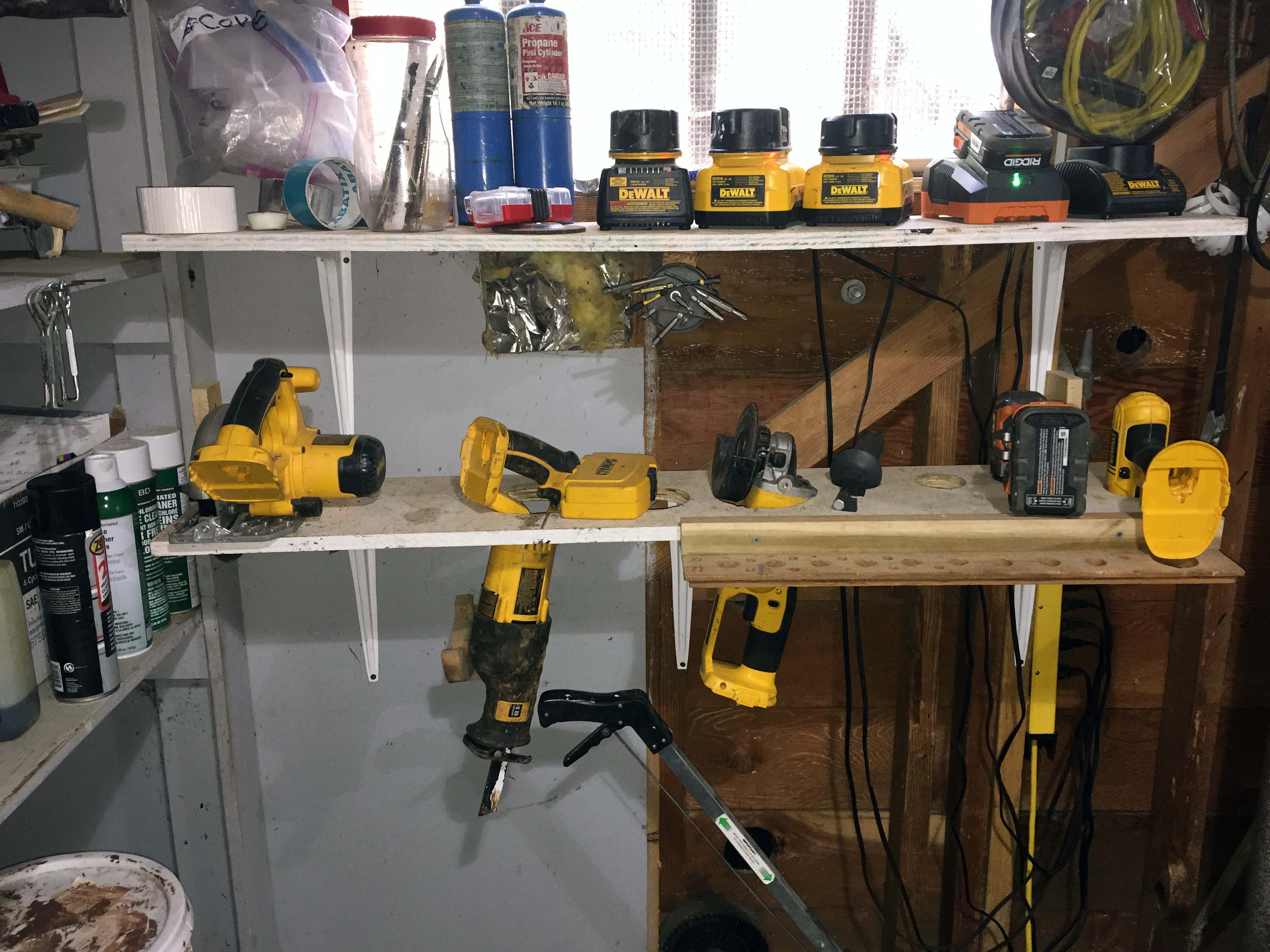 (I actually liked this. Someone had put up a little shelf with holes cut into it for the power tools. However, the shelf was all the way in the back corner, and hard to get to. There were also piles of tools in soft bags and hard cases stacked on a table to the right of this photo. – Lee)