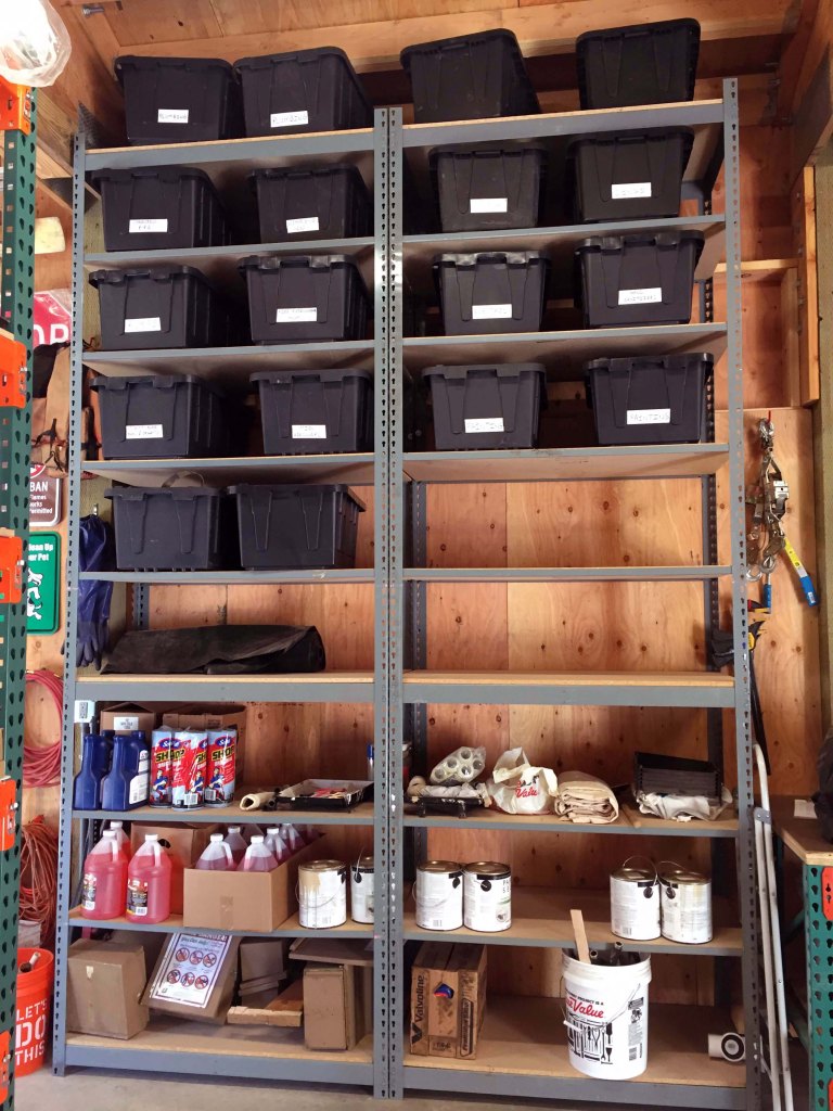 Here’s my better idea for the shelves. All the shelves are the same height, and instead of loose stuff, I put everything in heavy duty totes, so they can be labelled and to keep things from just being scattered all over the shelves. the paint will live on the lower shelves, but it goes to a different building that’s heated in the winter.