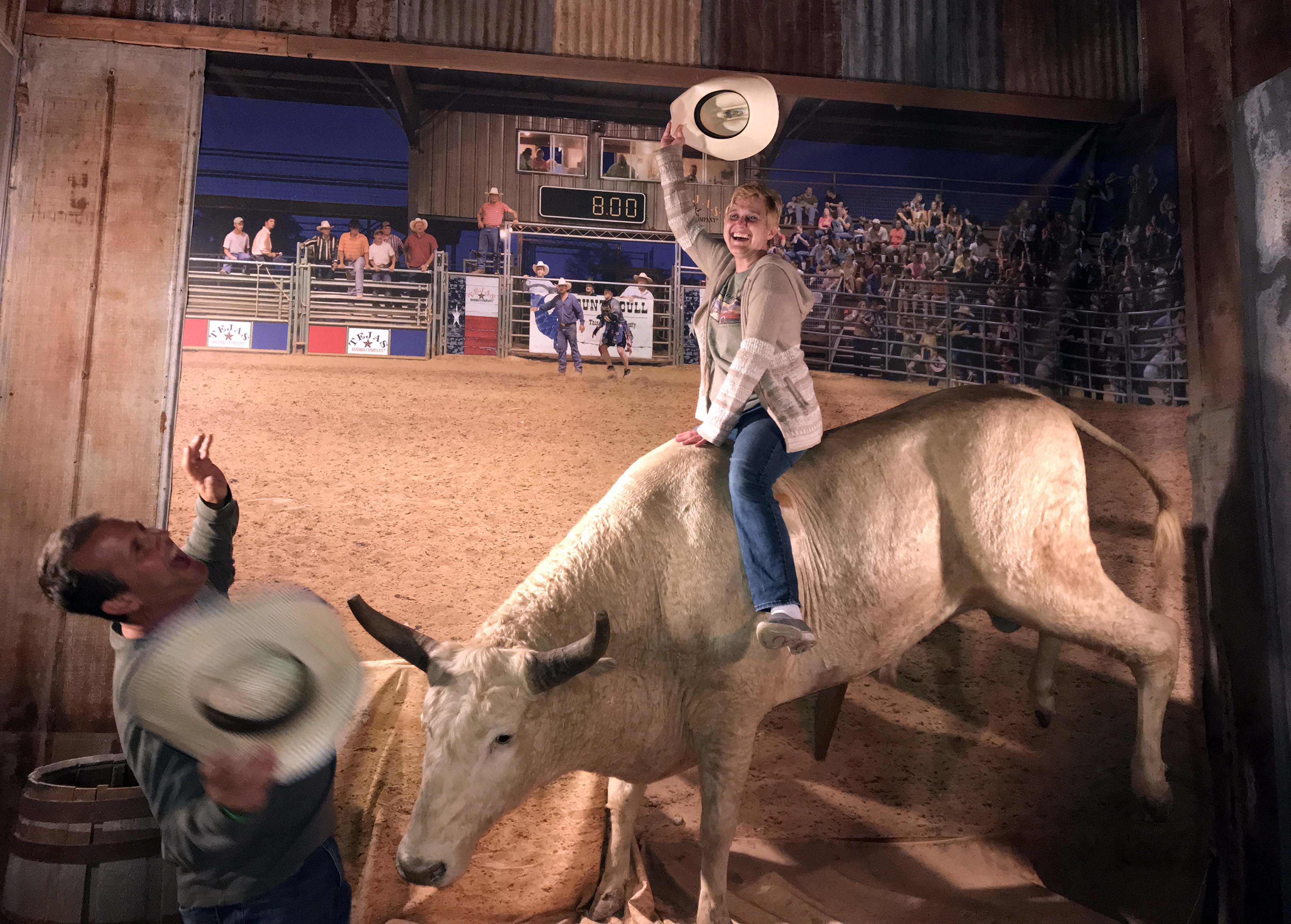 It was a really fun night and before we left I paid the $5 to sit on a stuffed(?) bull. We took some group pictures to commemorate the experience. Greg’s always up for something fun and he was cracking me up in this pic.