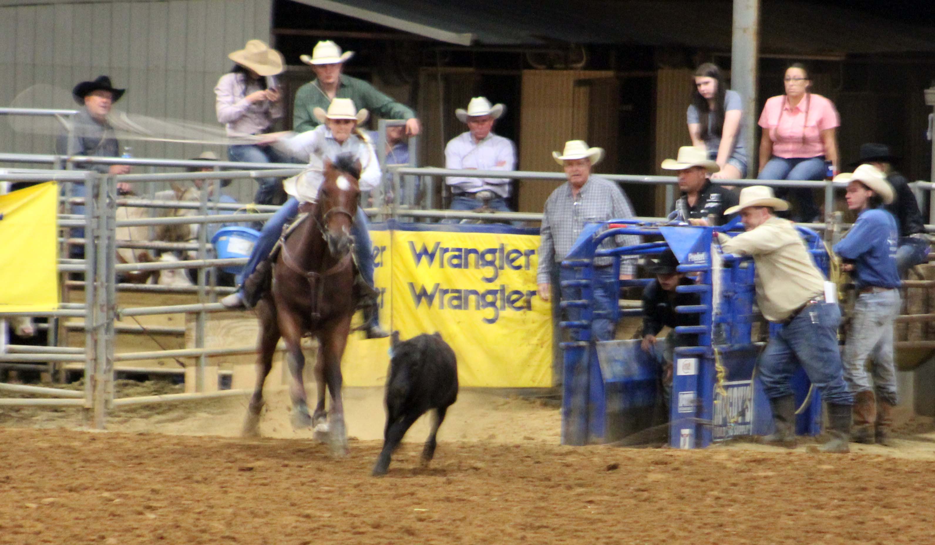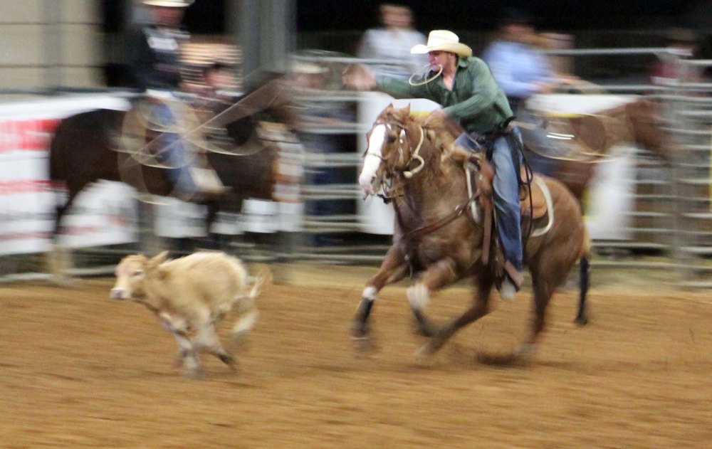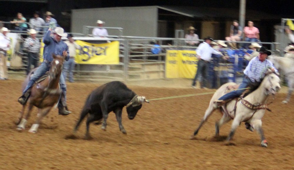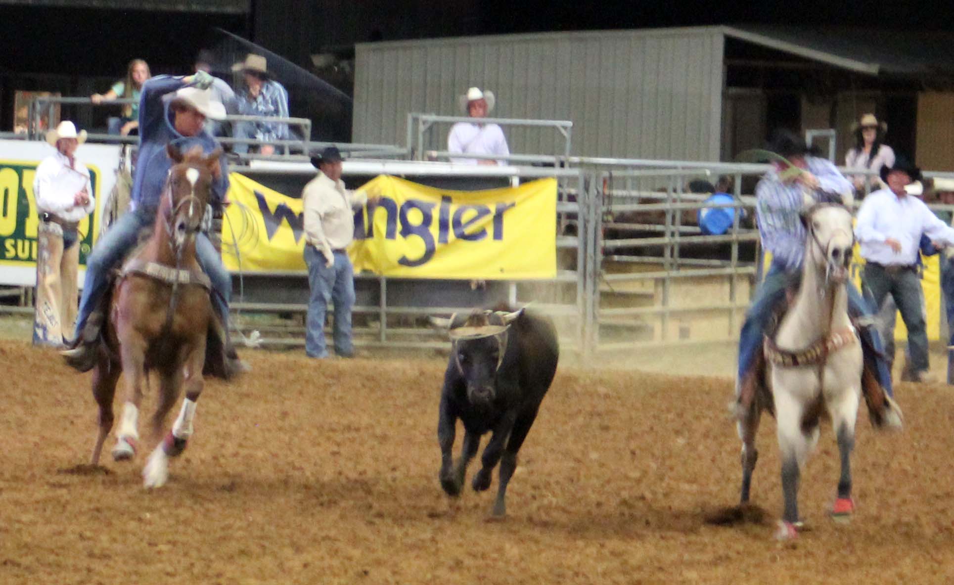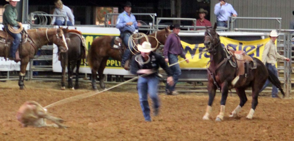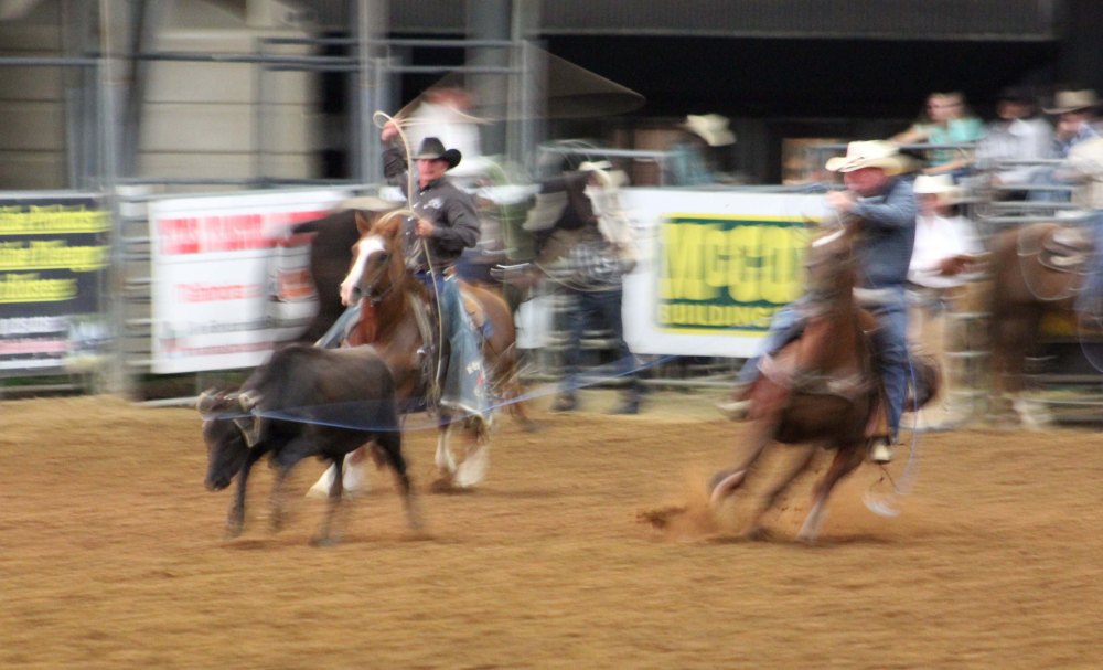 Cowboy pairs calf roping. One ropes the front and the other the back requires some serious coordination