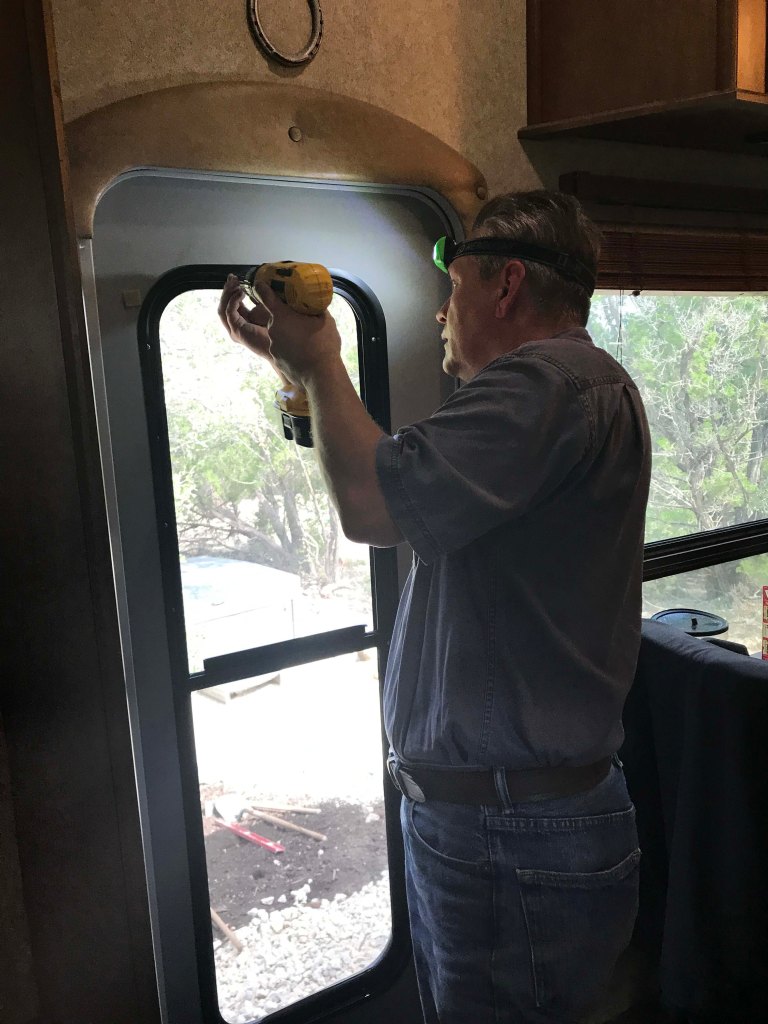 While I was working on admin stuff, Lee was trying to work through his list of repair items.  One of the biggest one was to finally fix our door, which as you might remember was shattered by a wind storm back in April.  Lee has spent weeks trying to find a solution and ultimately called the door manufacturer who said they could make a custom window insert for the door.  We were both excited when it arrived in a heavy packing crate, but were disappointed that one metal corner was bent and more importantly the plastic catch for the window had broken off in transit.  Lee was faced with sending it back, which we didn’t want to do, but then realized he could take the catch off the previous broken window, and put it on the new one.  That sounds easier than it was though for a variety of reasons, but now we have a working window in the door and you can’t even tell it was broken.  Awesome, and I really appreciate all the trouble he has gone through to get this done.