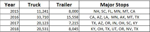 The trailer traveled 8,045 miles in Year Four with a lifetime total of 41,947 miles. The truck traveled 20,531 with a lifetime total of 99,397 miles. Here is a comparison of the four years we have been on the road. The truck mileage is low in 2015 because I still had my company car which I put an additional 9,800 miles on. The spike in mileage in 2016 is due to a trip to the trip to Alaska.