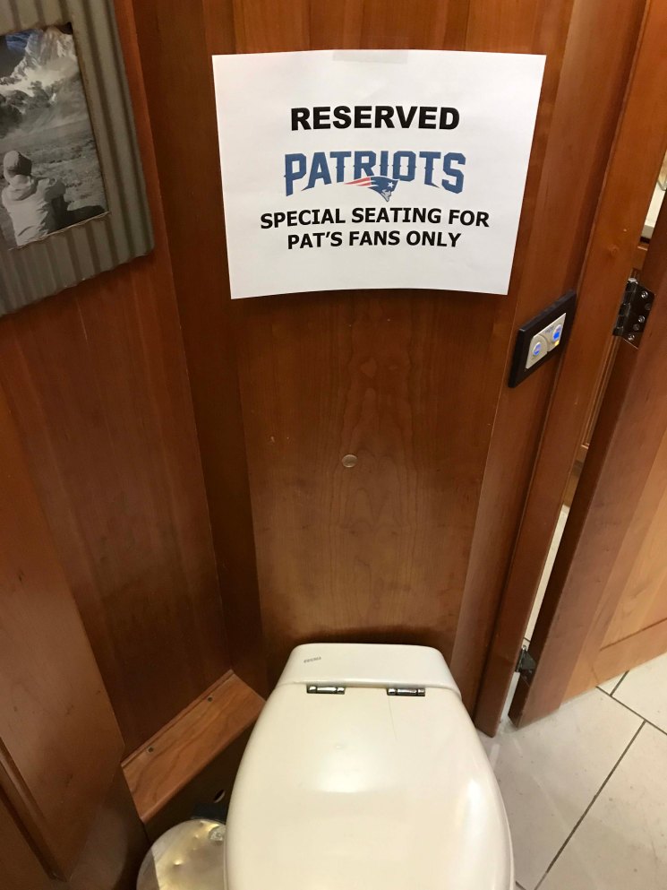 Watching the Pats versus Eagles Superbowl with Cori. She’s a hug Eagles fan as you can tell by the special seat she made for me in the bathroom! The fact that we were in the same place while our two favorite teams played each other was truly serendipity. I was even happy her team won. The Eagles were due.