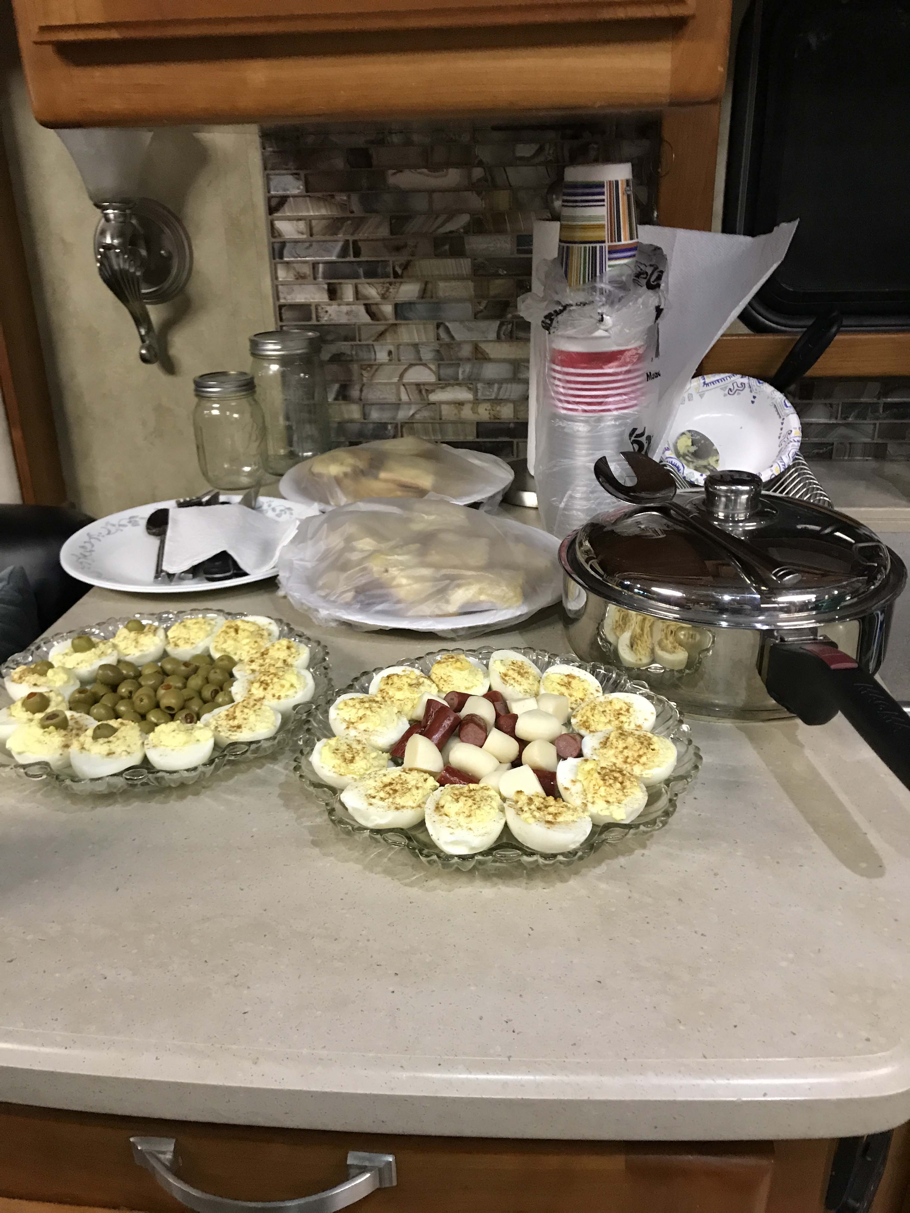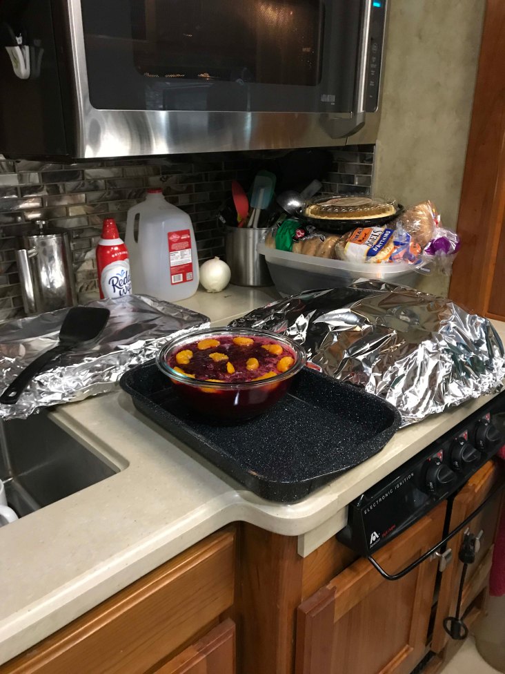 While Cori and Greg were at brunch with her family, Bill and Lee worked on rig stuff outside and I cooked up a storm. I miss the big family meals on the road, and ended up making two deserts, broccoli cheese casserole, stuffing, the eggs, and Lee made gravy, which admittedly was a ridiculous amount of food, but still fun.