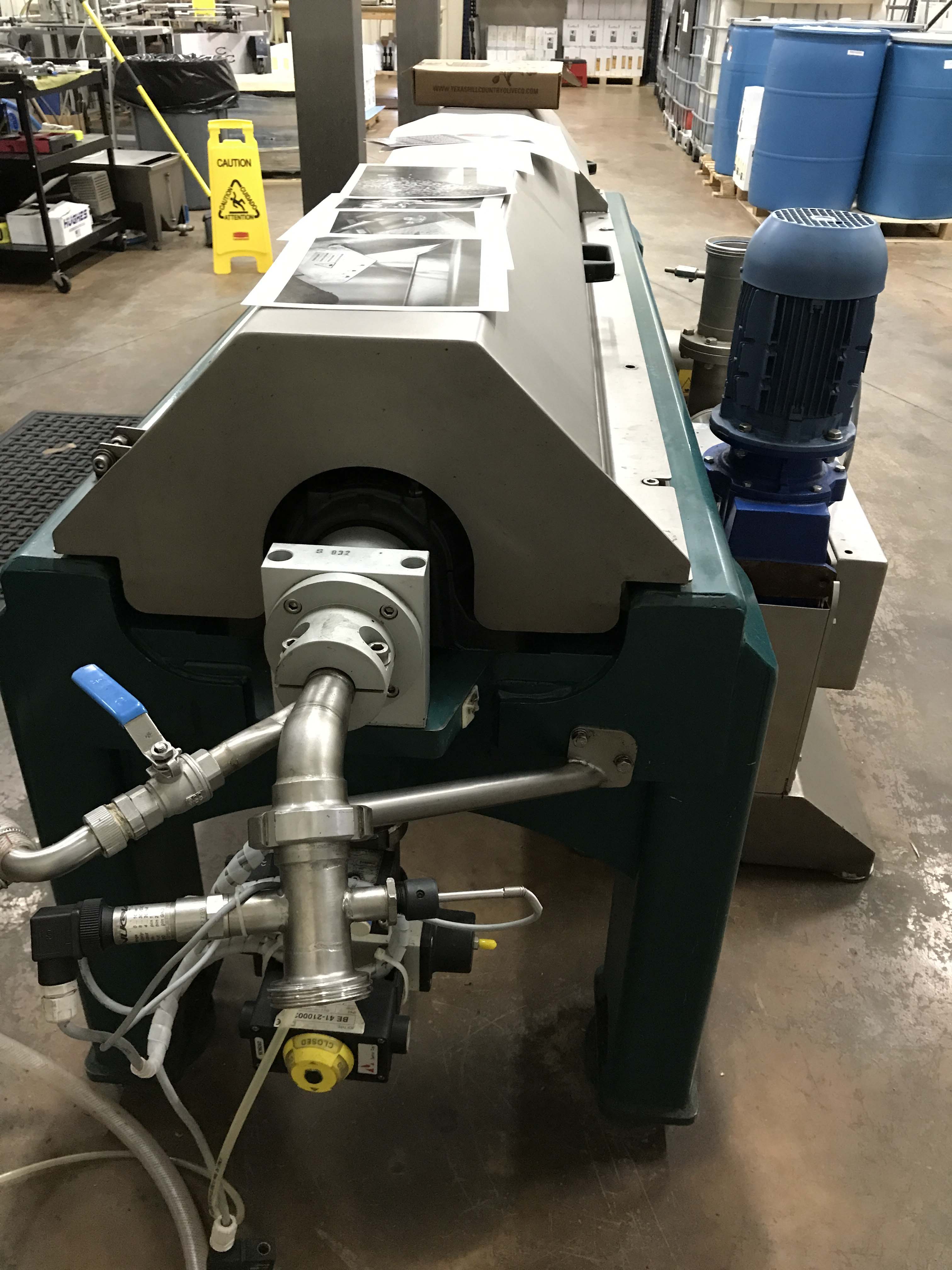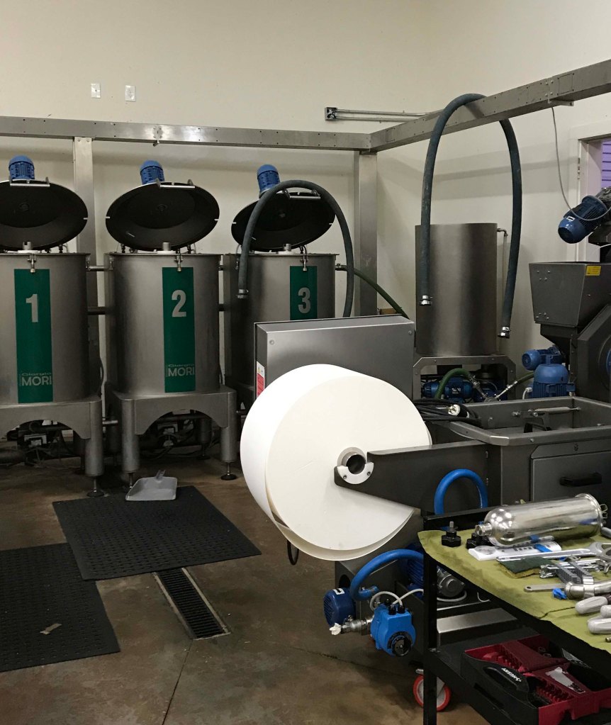 Next is the centrifuge which spins out the vegetative water (used in spa products), pulp (used to feed animals), and an olive oil “butter”.