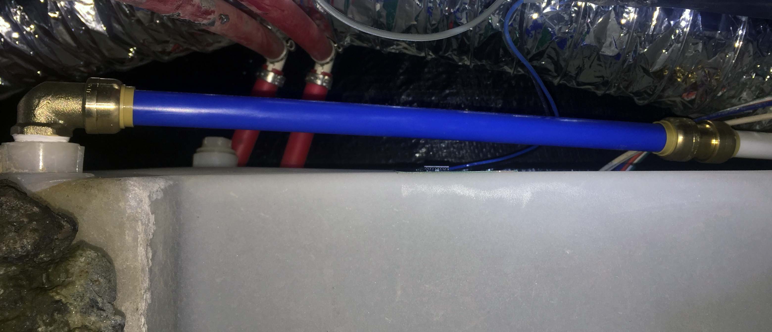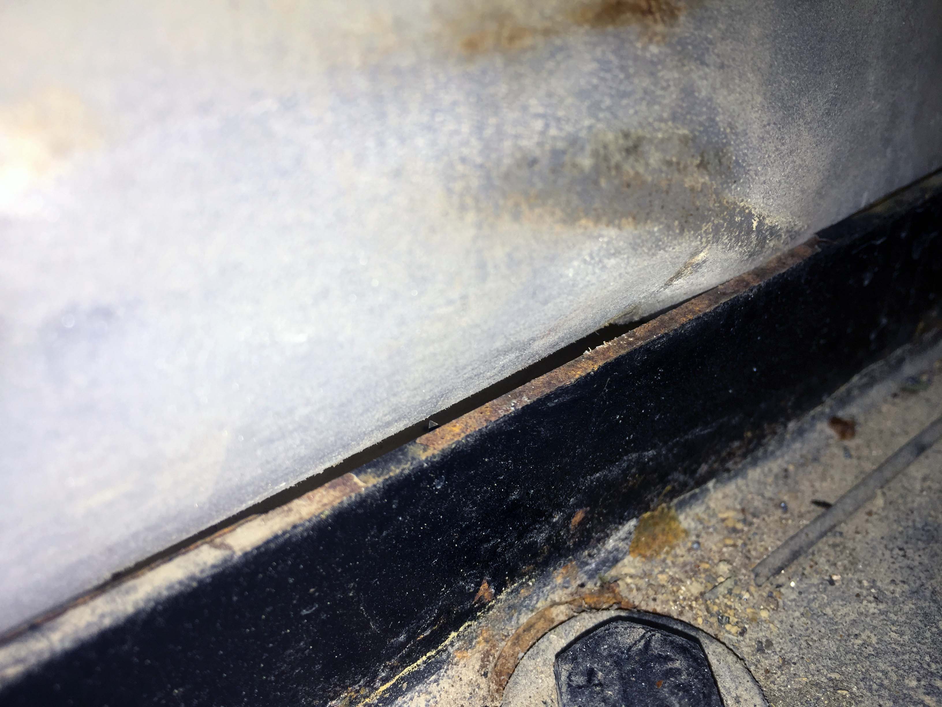 As you can see it’s settled a little, but it’s still not completely straightened out, and there’s still a pretty large amount of gap between the bottom of the tank at that wrinkle, and the wood. It was reasonably warm out, which helps plastic regain it’s shape, so I started the fresh water fill and sat under the rig with my head between the black and gray tank carefully watching and listening for anything that might indicate a leak. As it slowly filled, the weight and the warmth helped it settle in pretty well. After about 15 gallons I could already see it settling. It was a little like watching the minute hand on a clock move almost imperceptibly slowly, but it was definitely improving. I took a picture about every 10-15 gallons, and you can see the slow improvement.