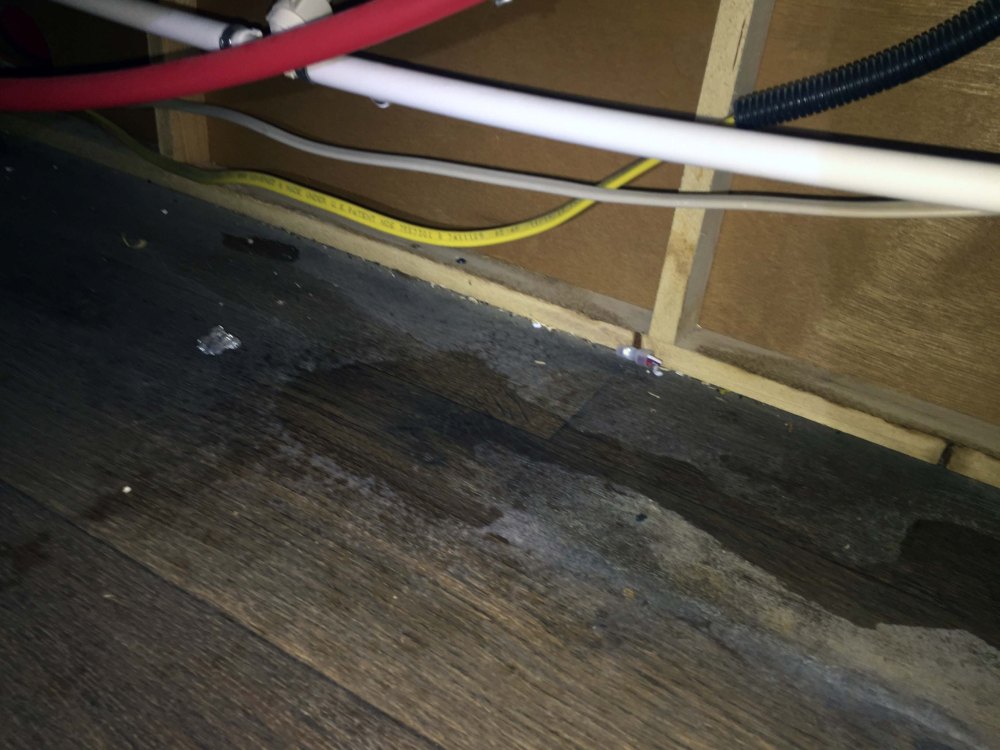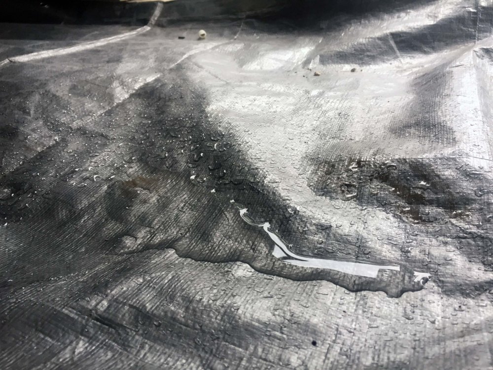 I looked at it very closely, and gave it a sniff. Not black water, or gray. So that’s good. It’s location wasn’t necessarily a clue to it’s origin, because water will always go downhill. So I started looking for it’s origin. The spatters and tiny drops around the puddle told me it wasn’t pooling there from elsewhere on the tarp, so it was dripping from directly above. It also couldn’t be a bad leak, because it was such a small amount of water. And it wasn’t black or gray, so it had to be fresh. Directly above it I saw where it was dripping from.