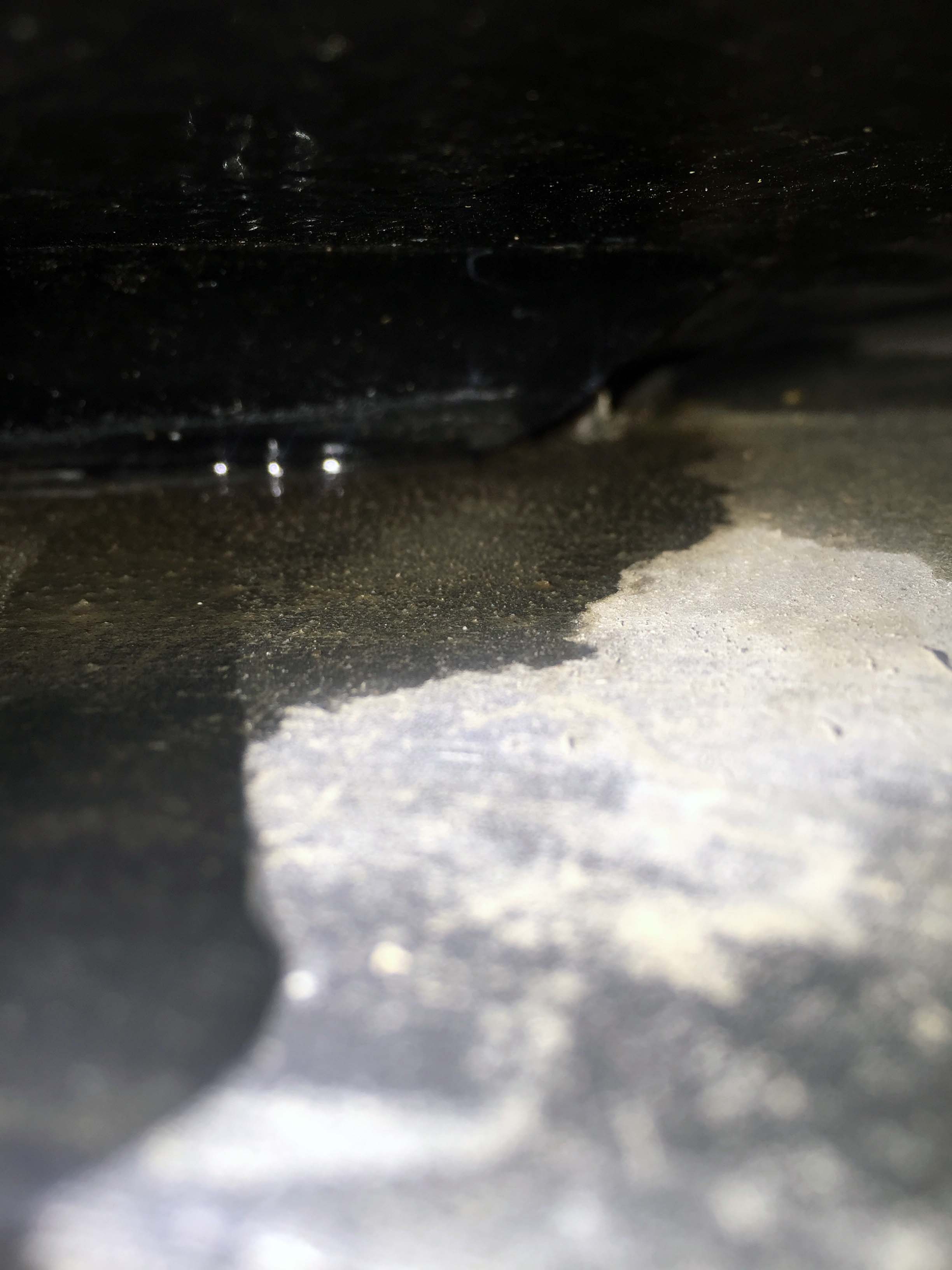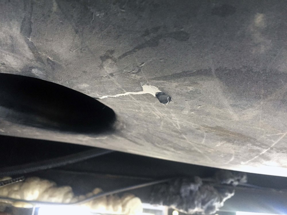Before I could put this new extension in, I needed to put on the new belly pan, so I got started on that. This was first thing in the morning, and as soon as I got under the rig to start taking measurements, I noticed a little puddle of water on the tarp, just below the middle of the black tank. Uh oh. It hadn’t rained, and it wasn’t dew. Double uh oh.