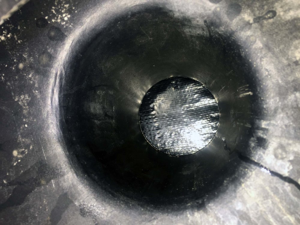 You can see where the water is running out from the edge of the hole and then dripping down. This is a “doughnut hole” formed into the black tank (the gray tank has two of them) I’m assuming to give the tank structural strength since it’s a very long rectangle. My immediate thought was, if the doughnut hole in the black tank is leaking, why doesn’t this water smell??? I looked up inside the hole.