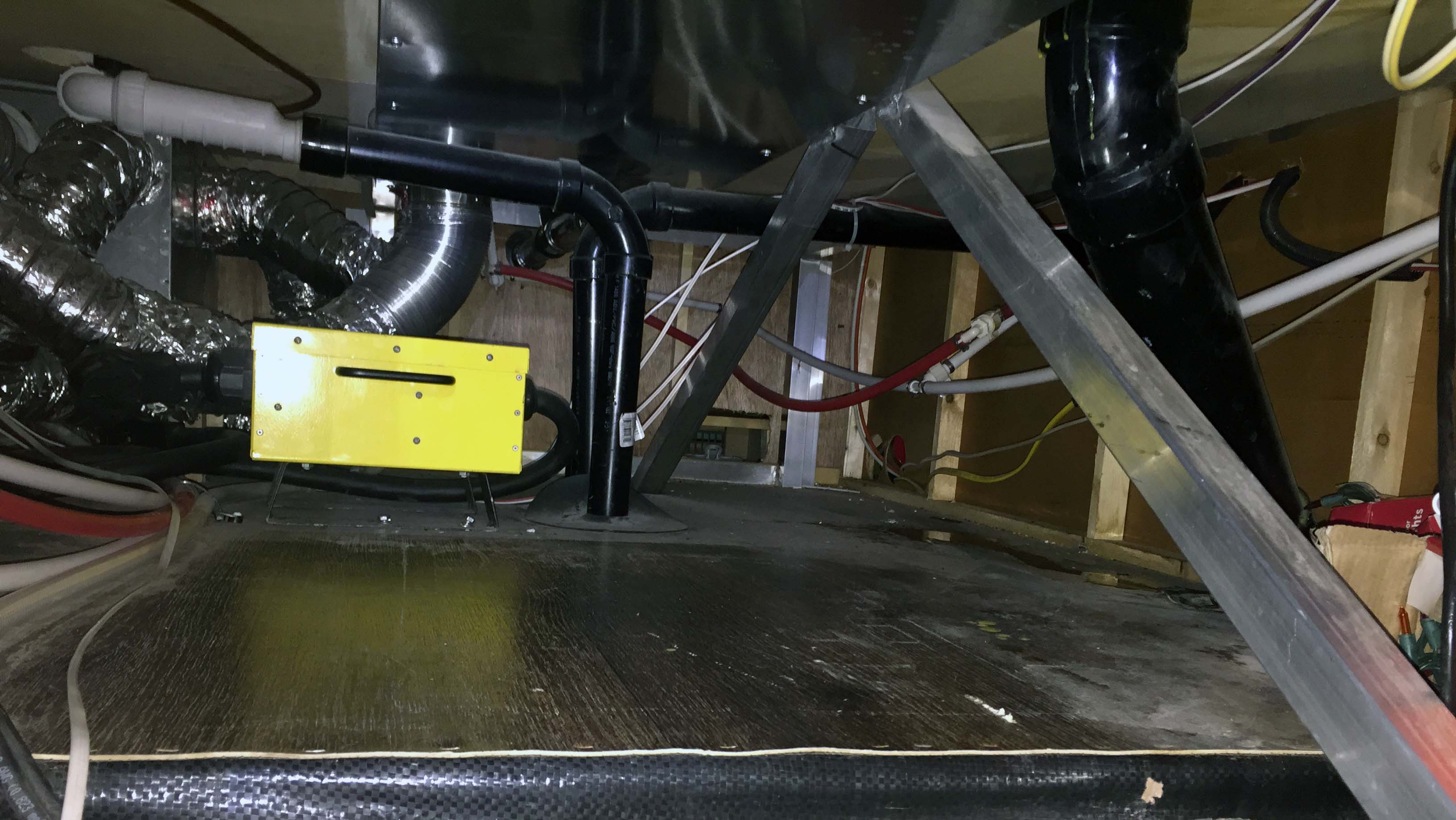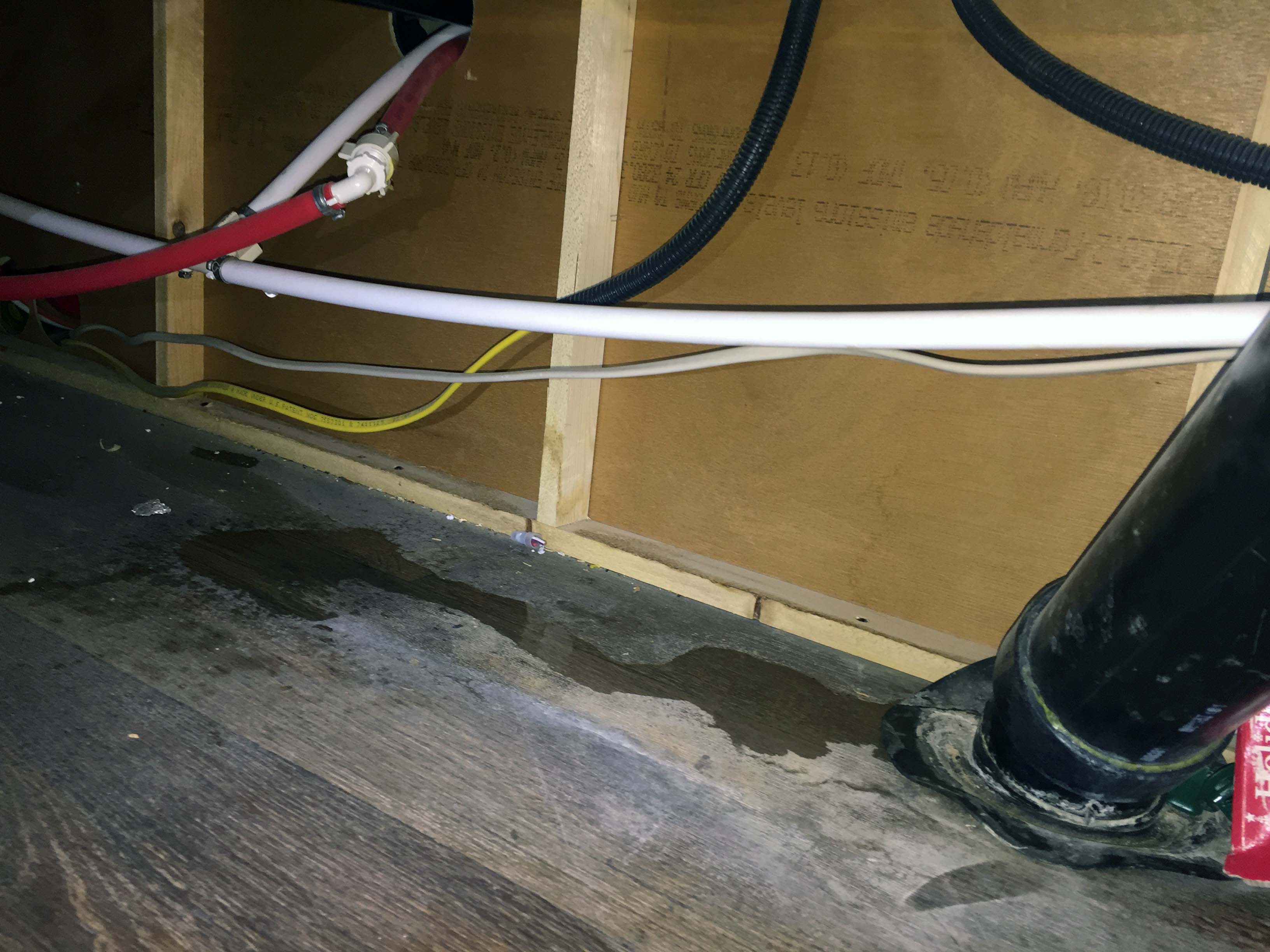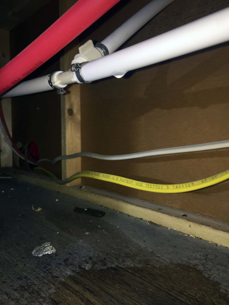 I could definitely see it was running along the top of the tank, not coming from the tank. Luckily, I have been over almost every inch of my rig, so I knew what was above and forward of this position. I crawled out from under, and then climbed up inside the crawl space between the rear storage and the kitchen, where the water heater, furnace, and all the water pipes are. Can you spot the next clue??? This is all feeling a little CSI, but pretty cool. He’s using a scope and phone to see stuff. Gotta love that- Trace