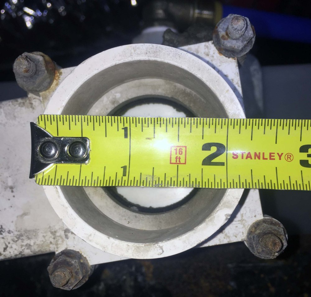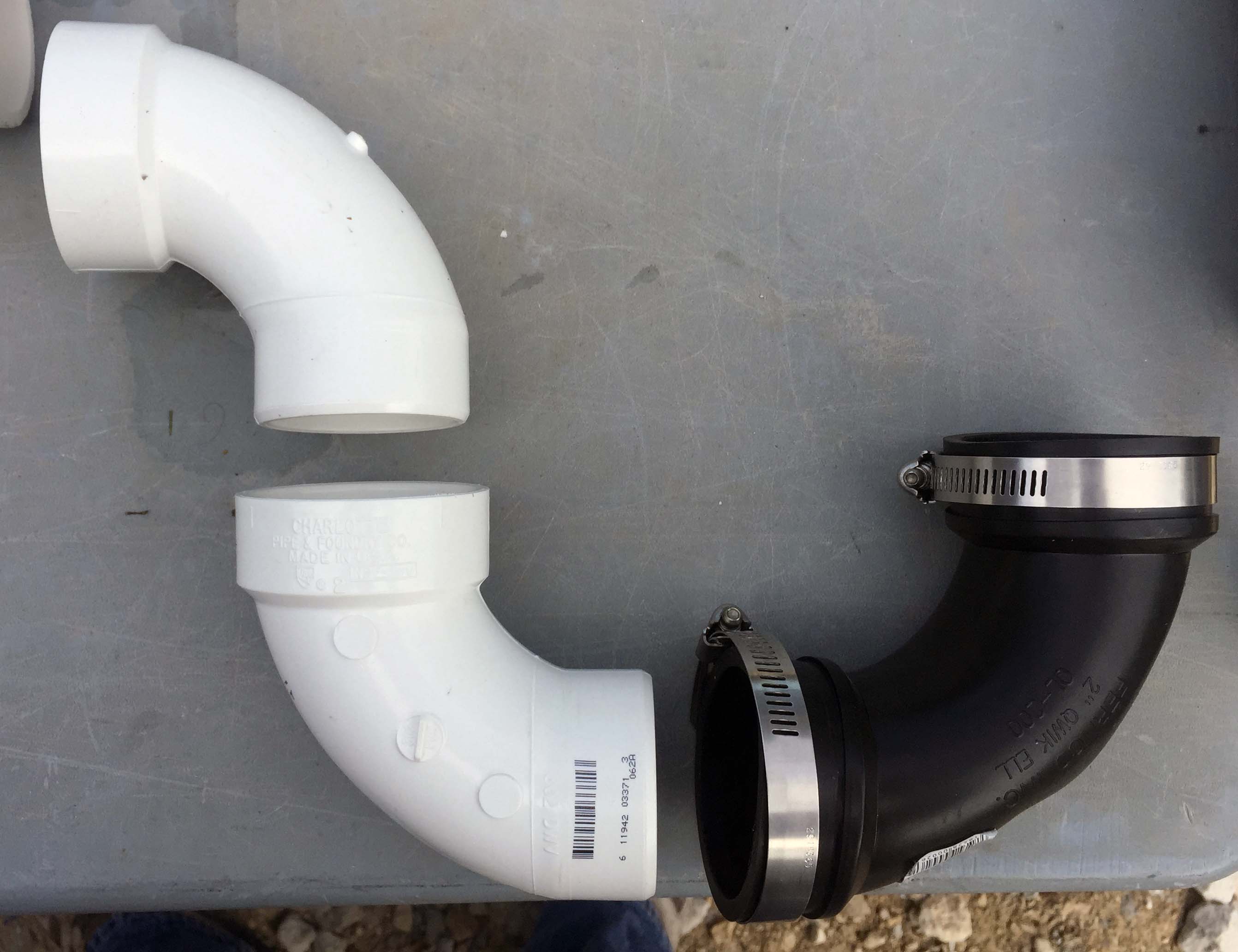 To start with, a 2″ rubber elbow that would allow me to attach to the fitting, and would have the added bonus of a little flexibility. Then a couple of other elbows that would allow me to rotate the whole thing to move it from near the center of the rig more to the outside, and back up to the level of the valve so it wasn’t hanging too low.
