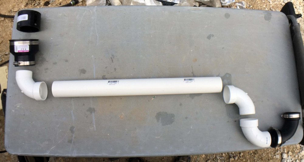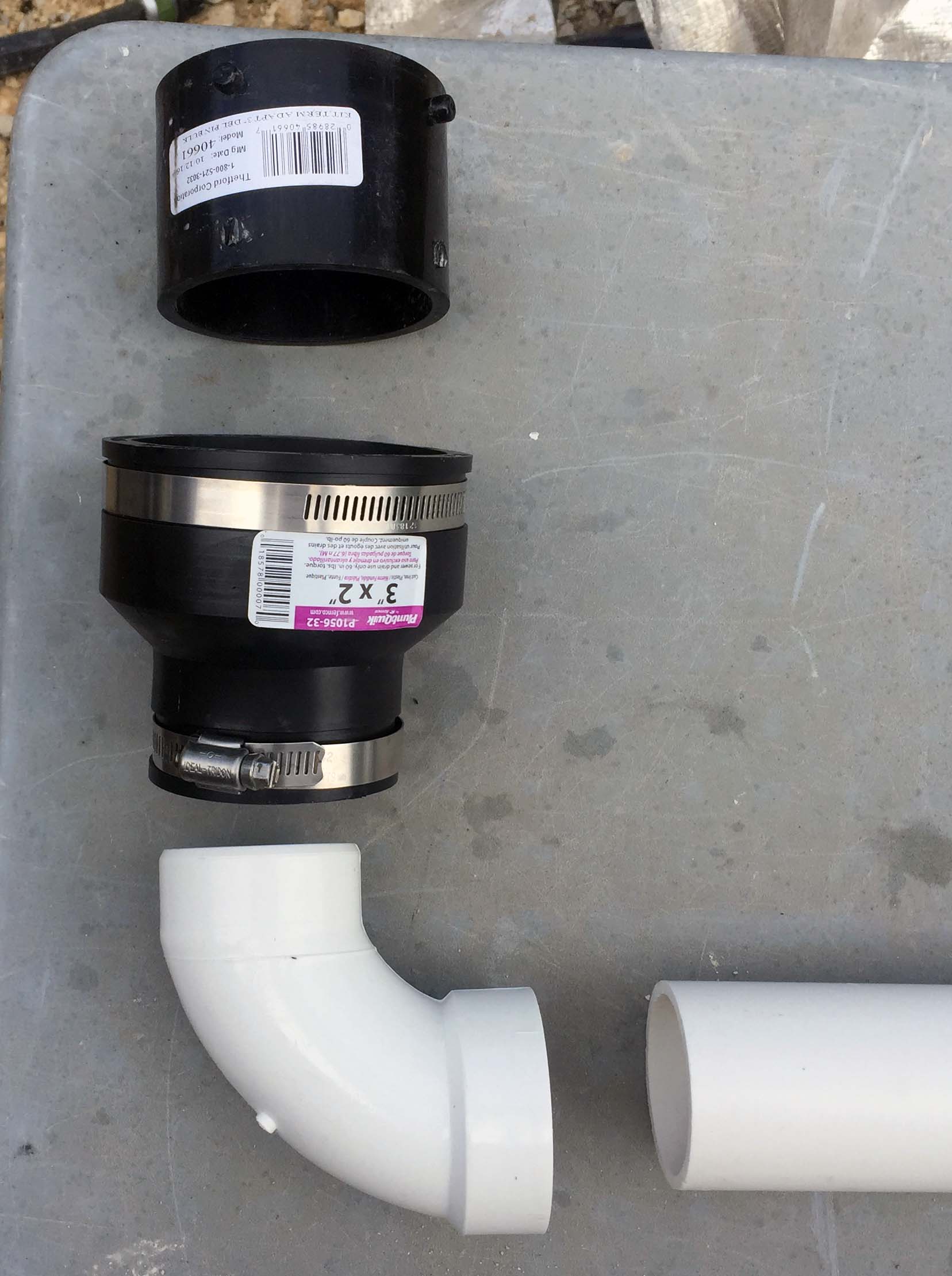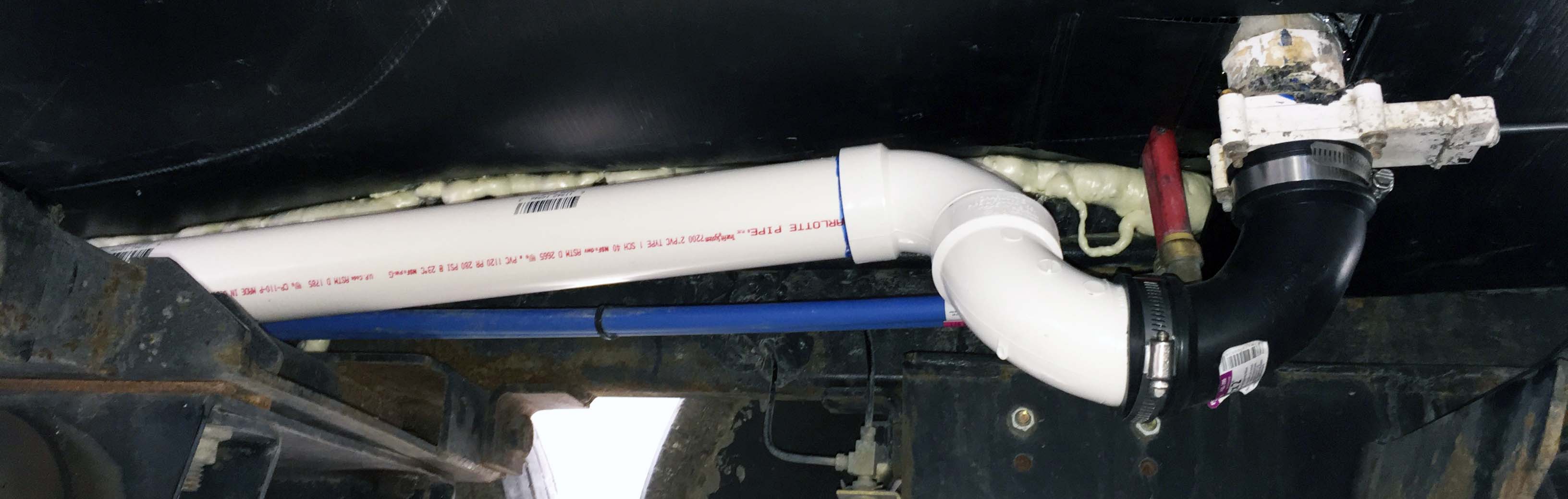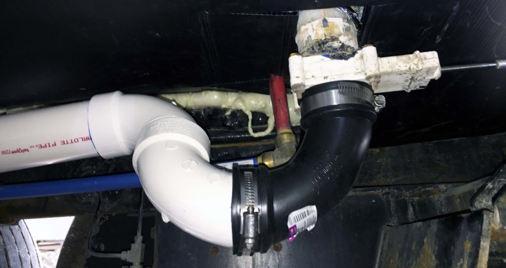 From there, around 5 or 6 feet of PVC pipe to get to the back of the rig where the sewer outlet is. Then I needed to be able to attach a standard sewer hose, so I found a 2″ to 3″ boot that would do the trick. When I could find nothing at all that had the bayonet fittings of a standard sewer hose, I got a male-to-male adaptor and used wire cutters to lop off one set of the bayonet lugs. Once that was in the boot and the boot tightened down, it acts as a standard waste connection for a standard sewer hose. I gotta say here this is why non-mechanical people glaze over during these explanations. If you don’t understand boot, bayonet, etc these sentences make no sense. – Trace