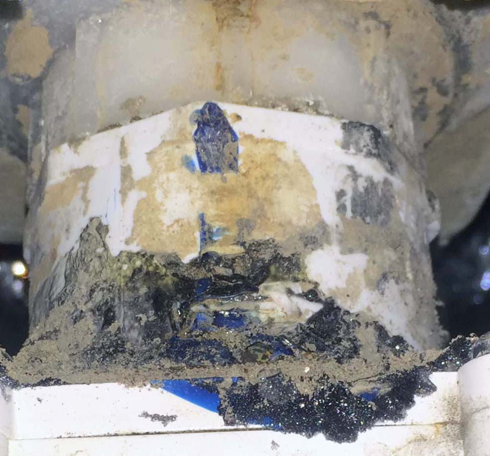 As you can see, at the top where it is attached to the fresh tank, it looks like it’s designed to be turned on with a wrench, because it’s 6 sided, but there’s also a fair amount of dried blue gunk around it, which leads me to believe it’s put on with PVC solvent cement.