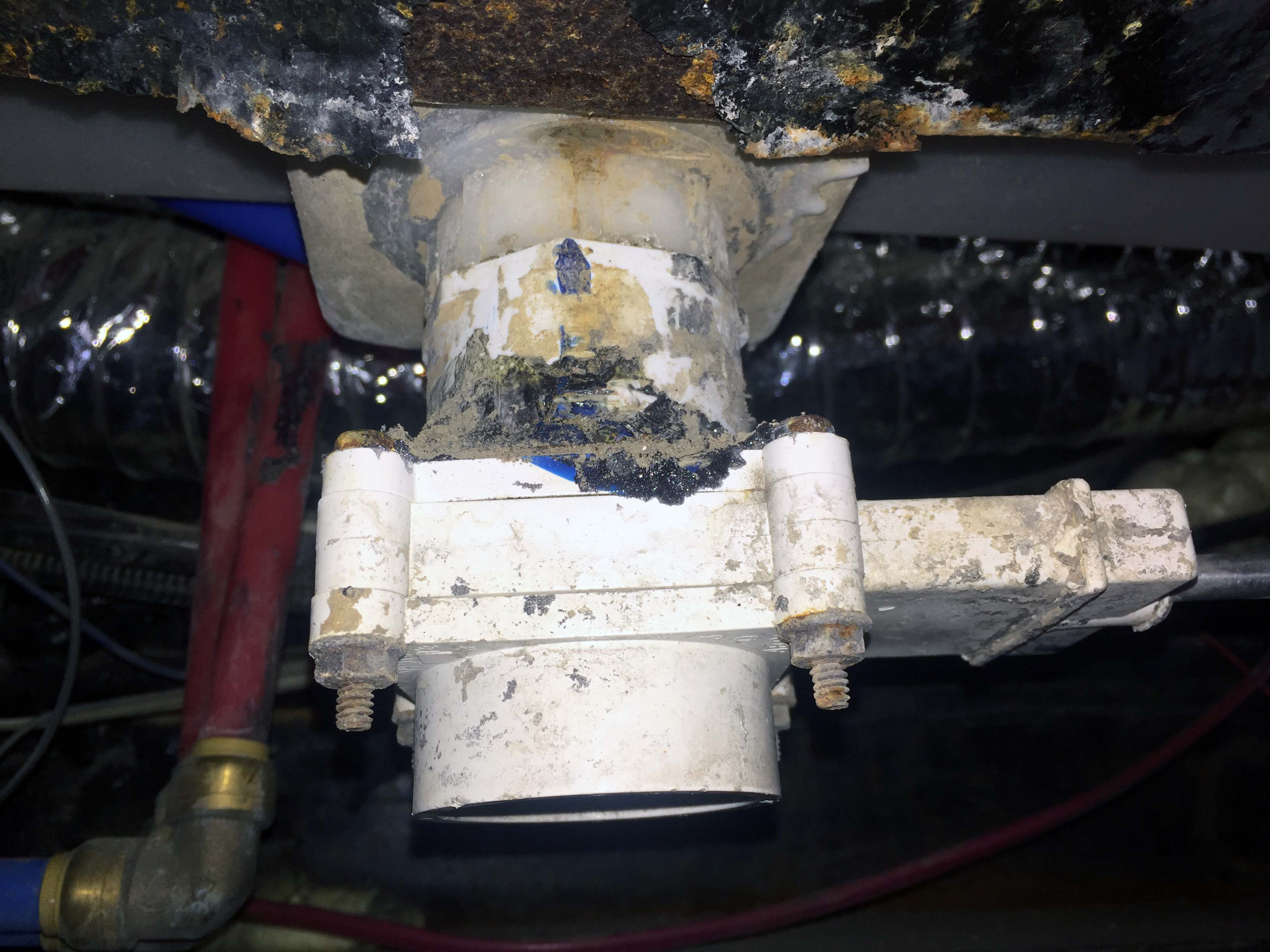 So there’s where the water is coming from before it hits the top of the black tank. The pipe to the right is where the toilet goes into the black tank, and that rubber flange around it is there to covert the gap between the hole in the floor and the pipe. You can see where water has evaporated around that flange, which tells me this tiny little leak has been going on off and of for a while, most likely.